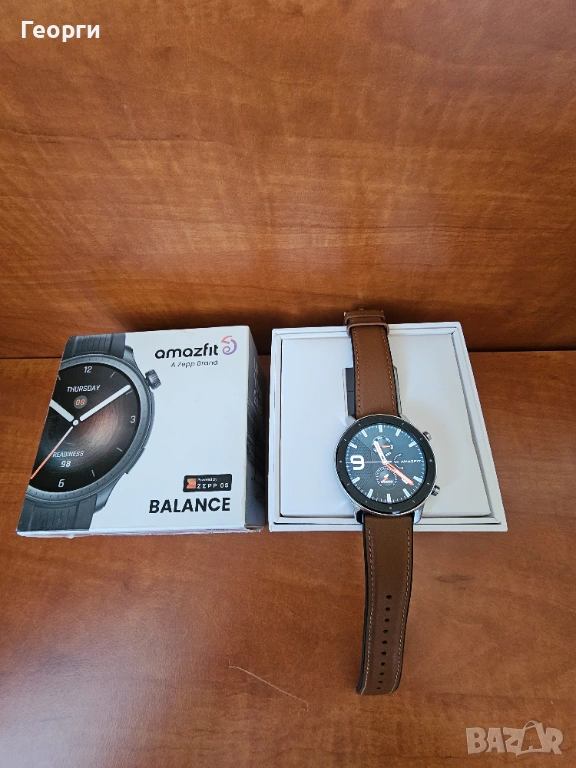 ова е смарт часовник Amazfit Balance. Дисплей: 1.5-инчов AMOLED дисплей с резолюция \(480\times 480\) пиксела. Операционна система: Zepp OS. Функции: Вграден GPS, Wi-Fi, Bluetooth 5.0, над 150 спортни режима и проследяване на съня. Пазарна Цена: Около \(250.00\) €.