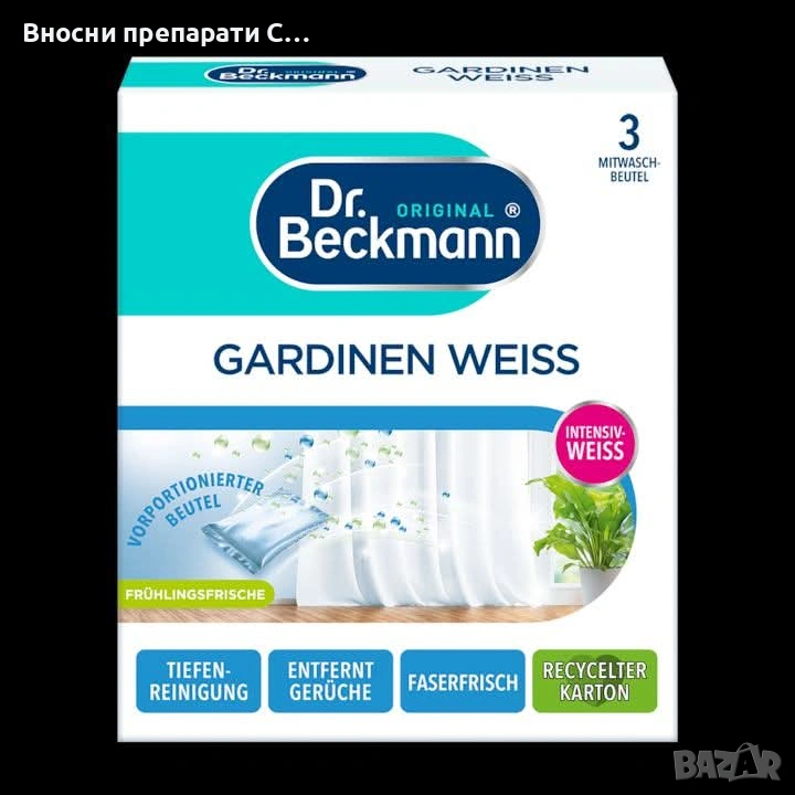 Dr. Beckmann Gardinen Weiß надеждно премахва упорития прах, мазни замърсявания и петна, осигурявайки дълбоко почистване на влакната. Елиминира никотина и други неприятни миризми. Благодарение на това завесите отново блестят наситено бели. Продуктът оставя свеж аромат, осигуряващ прекрасно усещане за свежест. Това прави Вашите воали и дантела отново да блестят. Ефективен от енергоспестяваща температура от 20 °C. Освен това е белина без хлор.