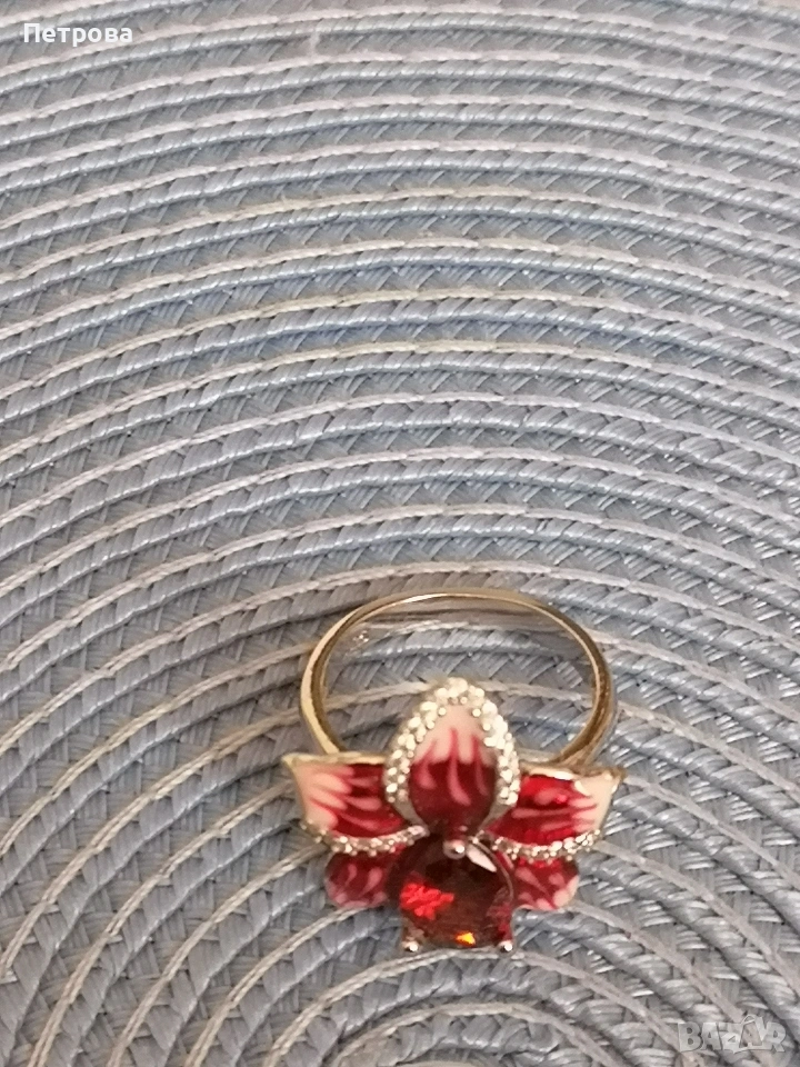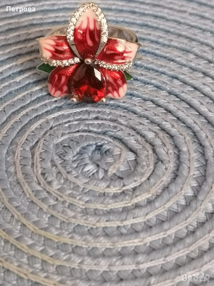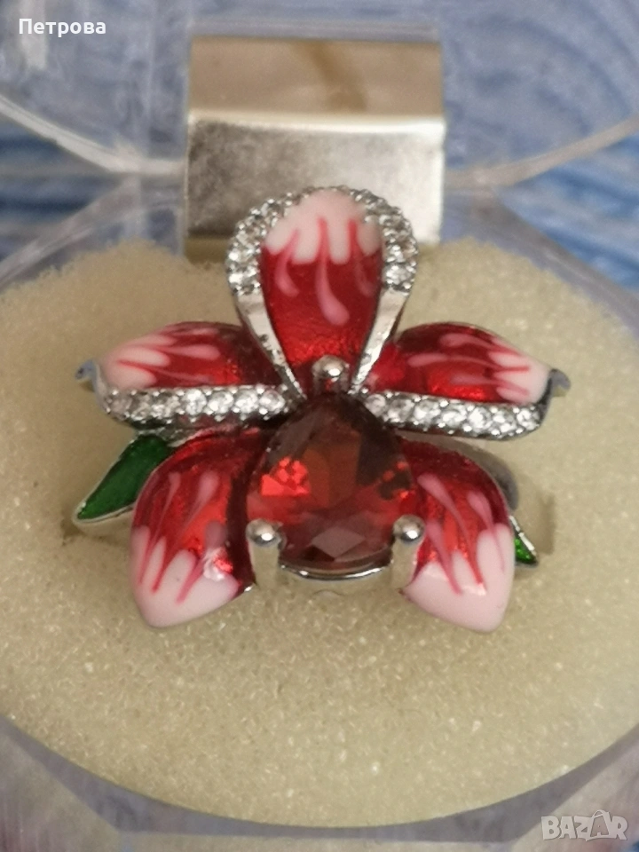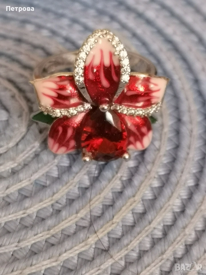 Сребърен пръстен с камък рубин и малки цирконии по листата. Истинско бижу. Проба 925. Размер 17 мм