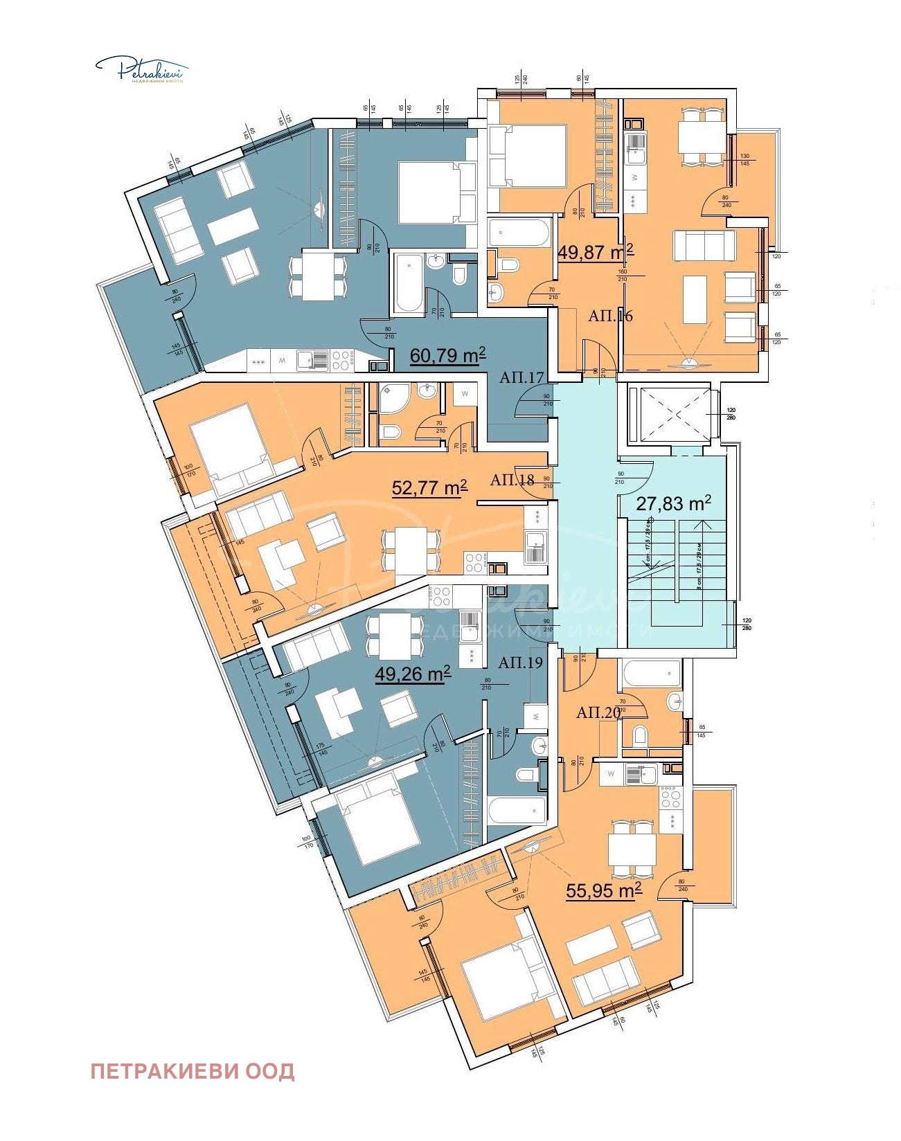 Двустайният апартамент е разположен на 4ти етаж, с обща площ от 67.78 кв.м, от които чиста площ 60.79 кв.м и общи части 6.99 кв.м.
