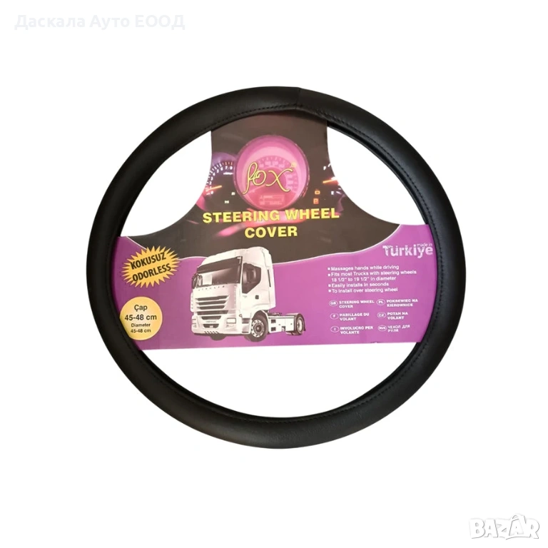 Калъф за волан с размер 45–48 cm, изработен от висококачествена черна кожа. Осигурява стабилен и комфортен захват, защитава волана от износване и замърсявания и придава елегантен и професионален вид на кабината. Лесен монтаж и дълготрайна употреба, подходящ за всички камиони и превозни средства.