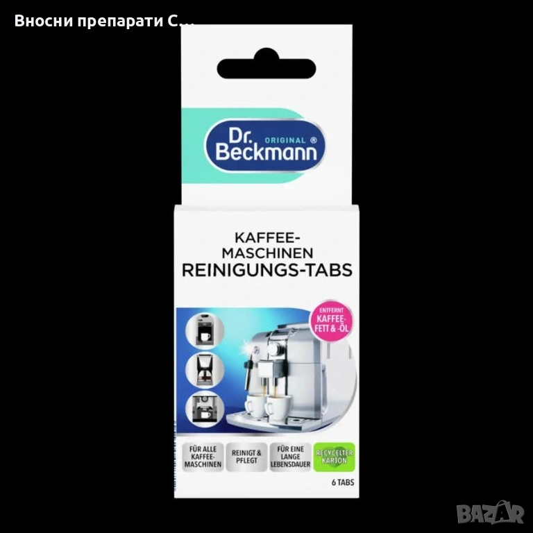 Dr. Beckmann Таблетки за почисване на кафемашина 6 броя в опаковка. За перфектно кафе и дълъг експлотационен живот на кафемашината е важно машината да се почиства редовно. Всеки път когато се използва се отлагат мазнини, масла от кафе и варовик, които могат да влошат функционирането на устройството.