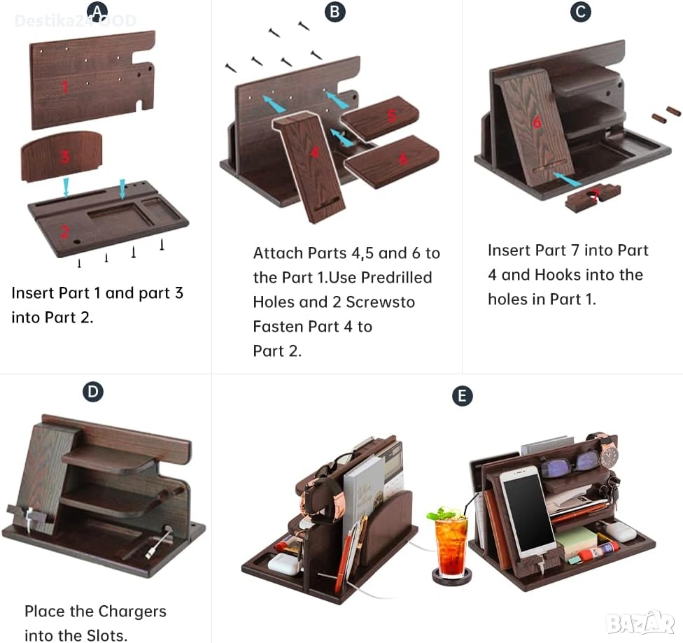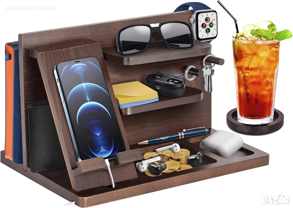 Дървена поставка органайзер за телефон, часовник и портфейл