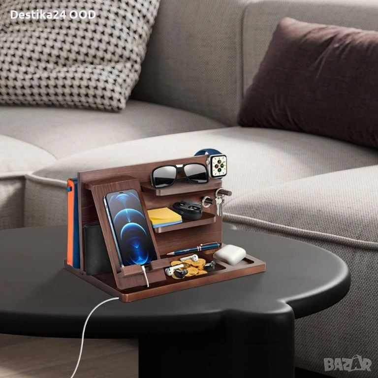 Стилен дървен органайзер за нощно шкафче или бюро – практично решение за подредба на телефон, часовник, портфейл, ключове и други ежедневни вещи.