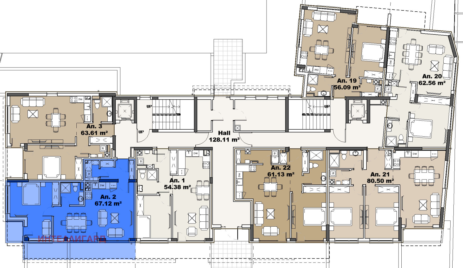 Предложеният за продажба апартамент е двустаен, среден и е със следното разположение: