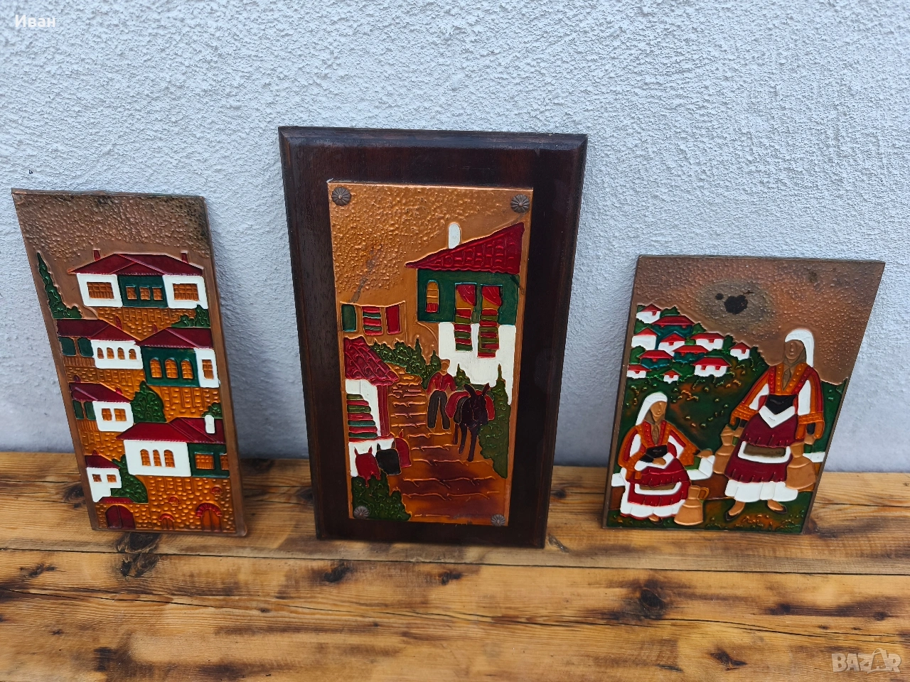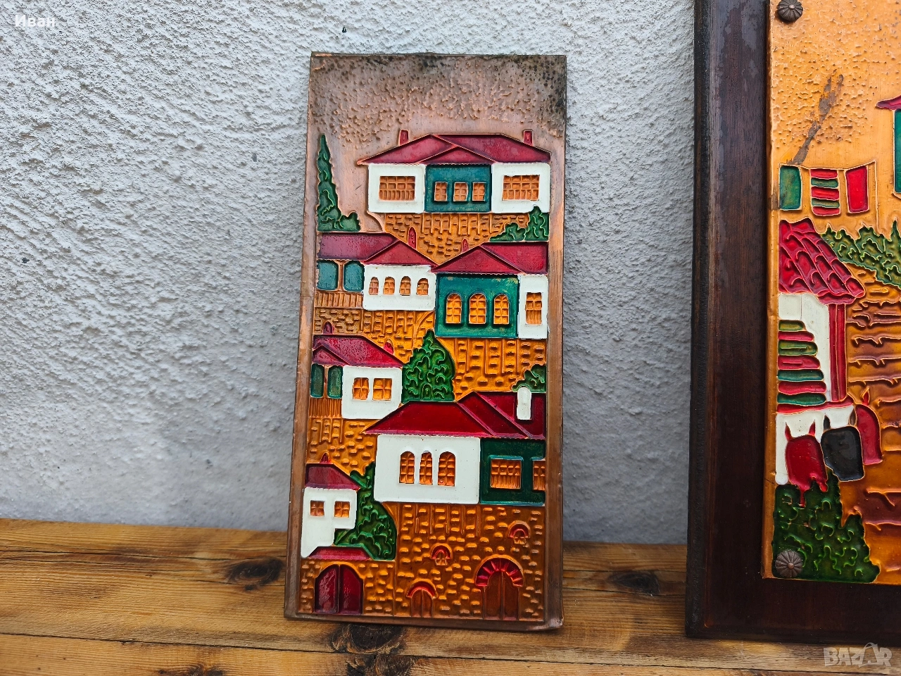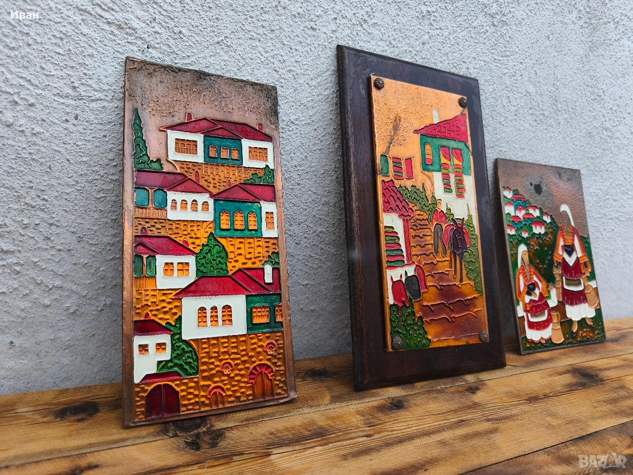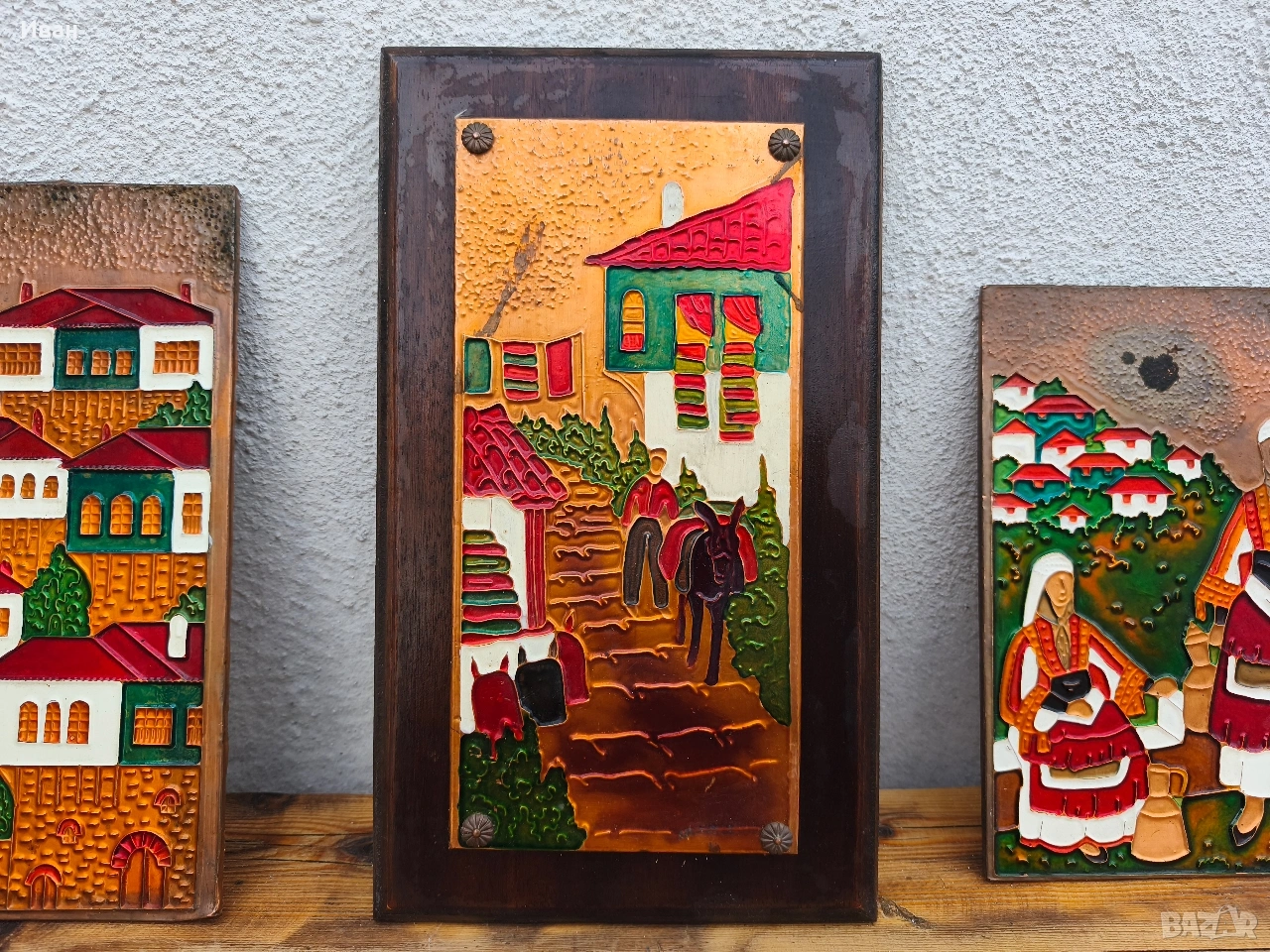 Медно пано с емайл Тази в средата с дървения гръб - 30 евро Други са по 20 евро за 1 брой Красиви и цветни Минимални забележки видни на снимките . При интерес имам и индивидуални снимки. Размери : Къщи -28,5/13 см Къщи с човек и магаре - 33/19 см Само на картината -27/13 см Моми - 24/17 см