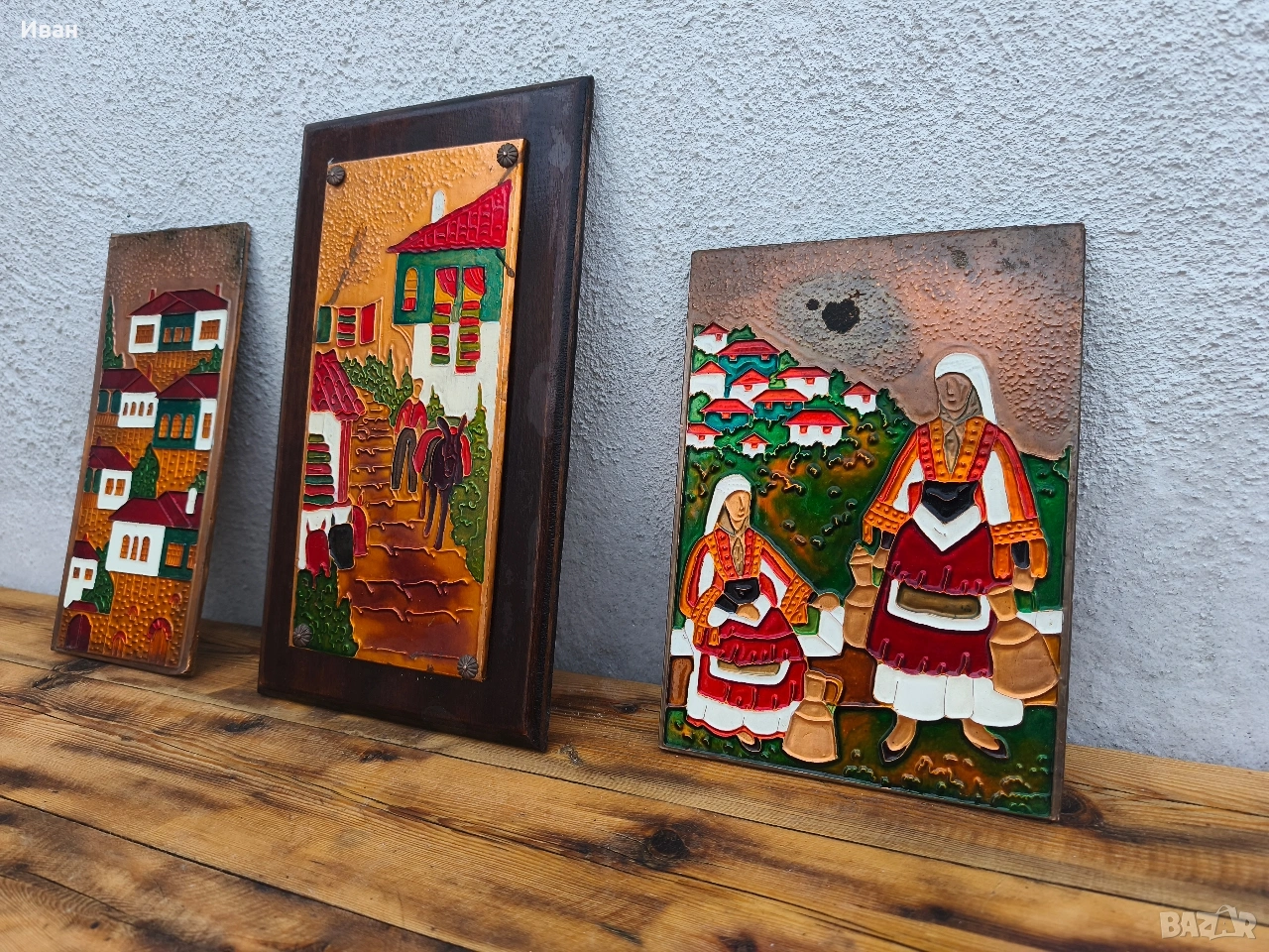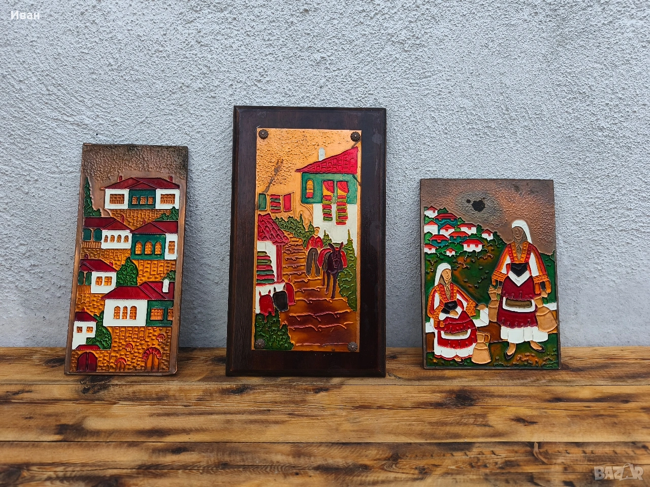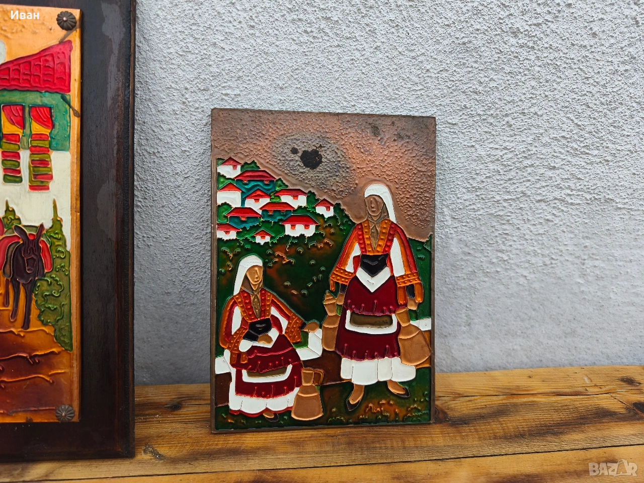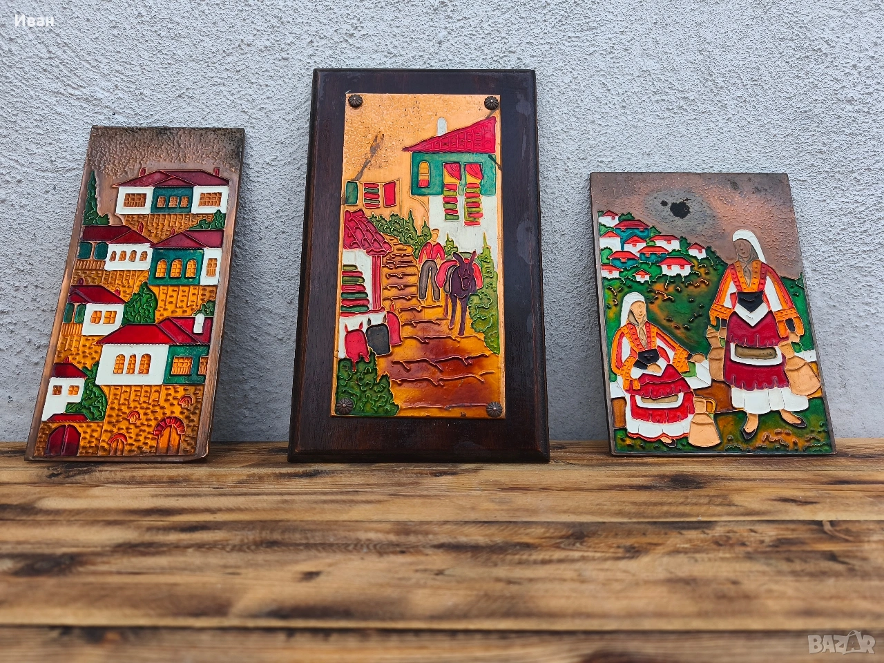 Медно пано с емайл Тази в средата с дървения гръб - 30 евро Други са по 20 евро за 1 брой Красиви и цветни Минимални забележки видни на снимките . При интерес имам и индивидуални снимки. Размери : Къщи -28,5/13 см Къщи с човек и магаре - 33/19 см Само на картината -27/13 см Моми - 24/17 см