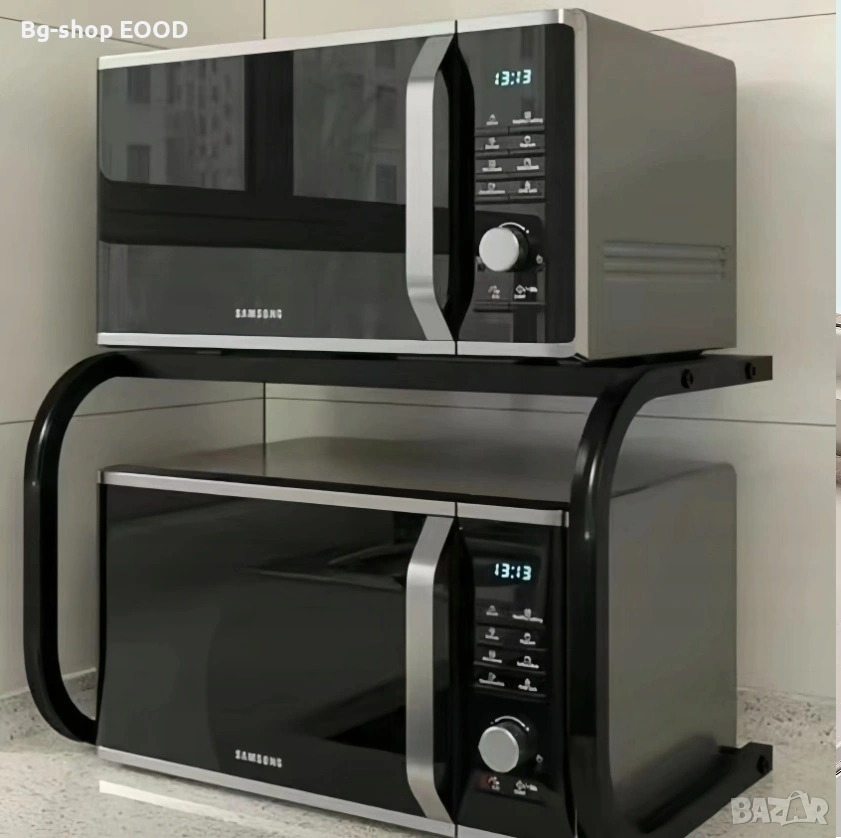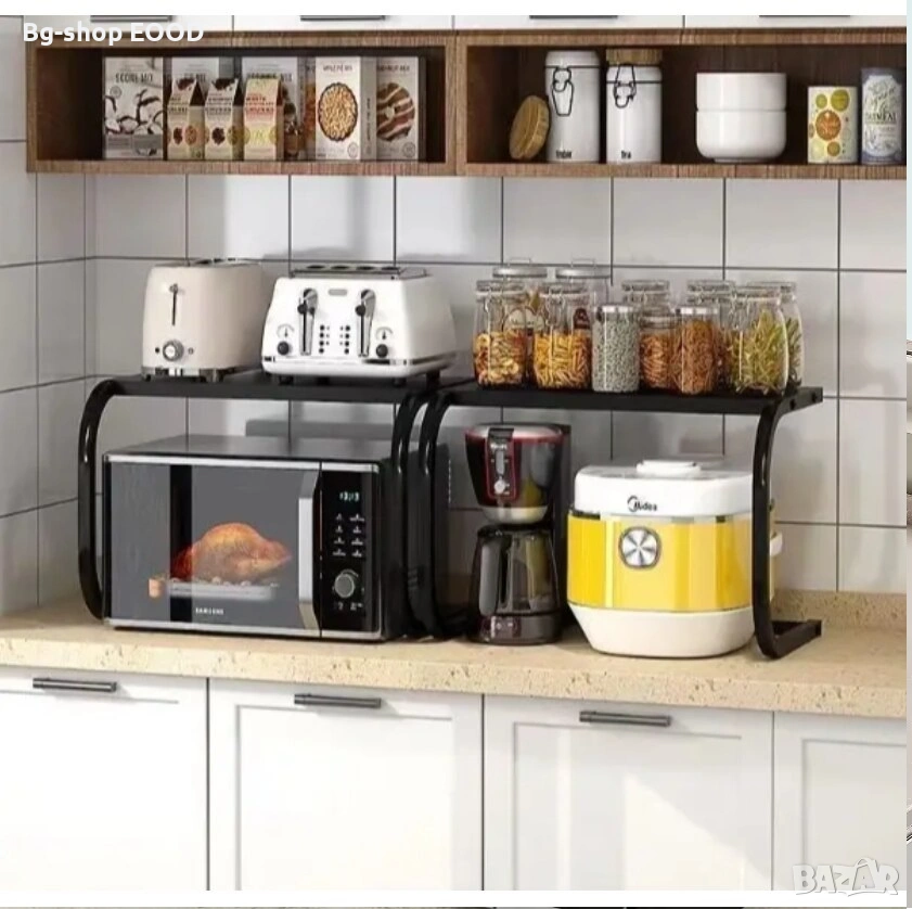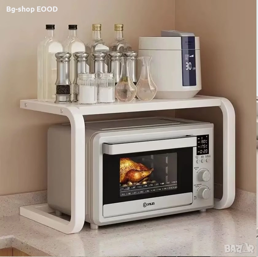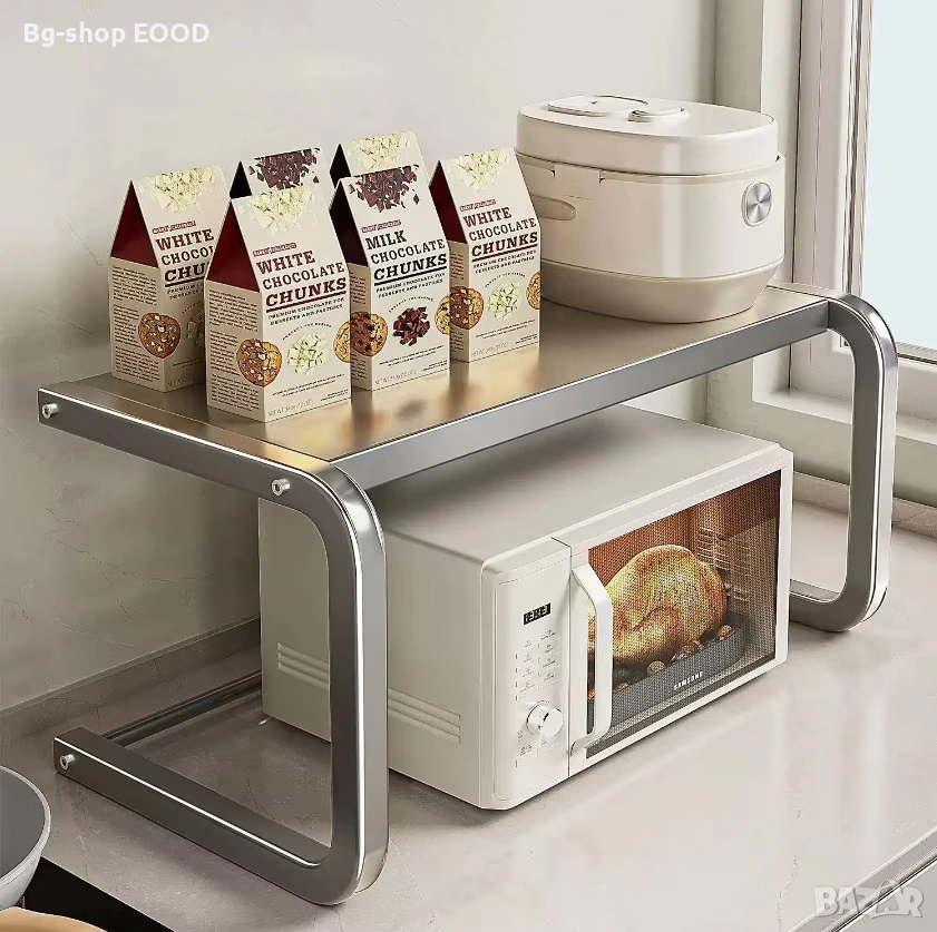 Практично и стилно решение за повече пространство в кухнята. Металната стойка осигурява допълнителен рафт над микровълновата печка и помага за по-добра организация на кухненските принадлежности.
