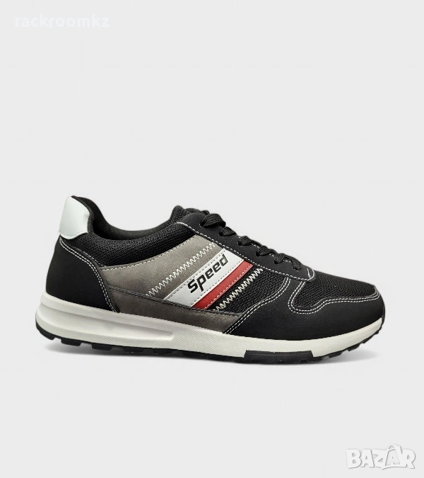 Модерни и удобни мъжки маратонки Speed в класическо черно-сиво съчетание с червени акценти – идеални за ежедневието или активна разходка.