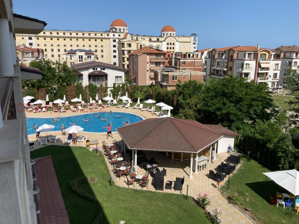 Изцяло южно изложение с гледка към басейна в комплекса и града.