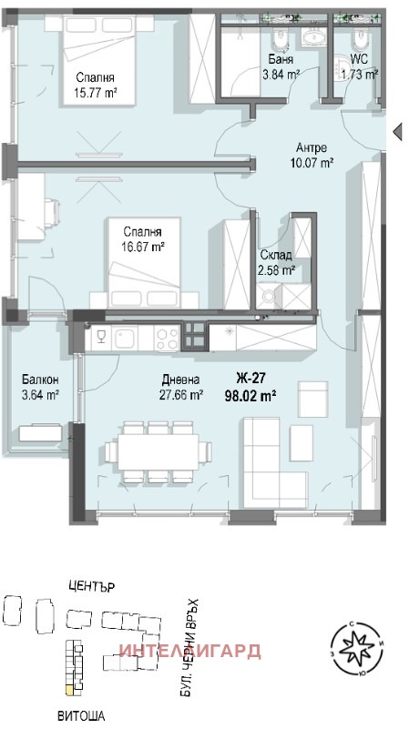 Сградата е построена с висококачествени строителни материали, с които се постига във висока степен много добра топло, хидро и шумоизолация, поставена е алуминиева дограма Reynaers, входни врати Solid В комплекса предлагаме и други апартаменти. Агенция Интеллигард си партнира със строителни фирми, които са се доказали на пазара с високо качество на строителство. Агенцията предлага своите експертни услуги юридически, инженерни и всичко необходимо в цялостния процес по избор,покупка, продажба, отдаване под наем, така че клиентите да бъдат сигурни и спокойни, че правят правилния избор в условията на техния защитен интерес. Разполагаме с възможности и да окажем необходимото съдействие на клиента, в случай, че има нужда от банково финансиране. Гъвкави схеми на плащане според възможностите и желание на клиента! За повече информация, Моля обадете се на предоставения телефон или направете запитване през контактната форма на intelliguard-bg.com! Изберете интелигентното решение!