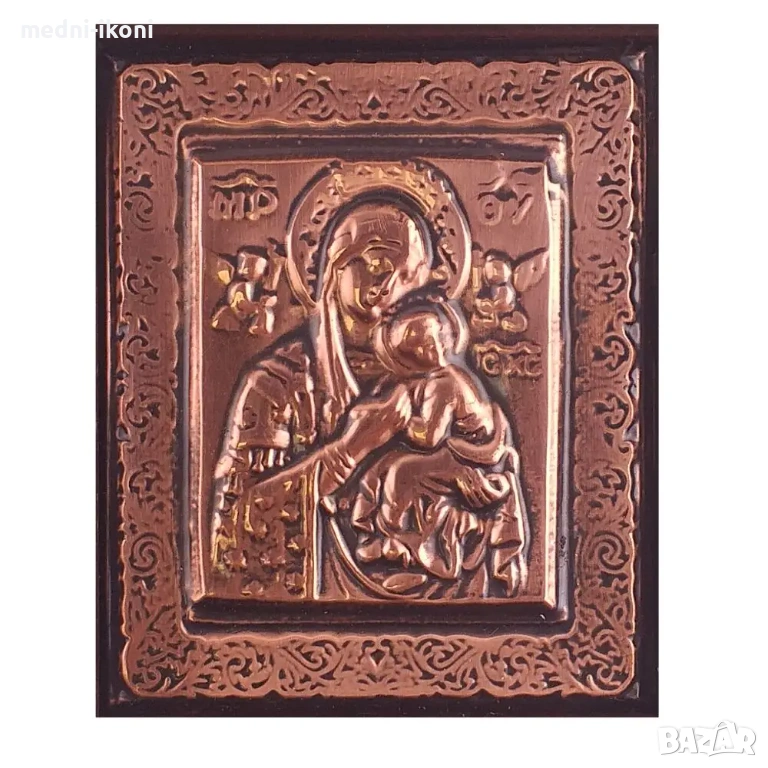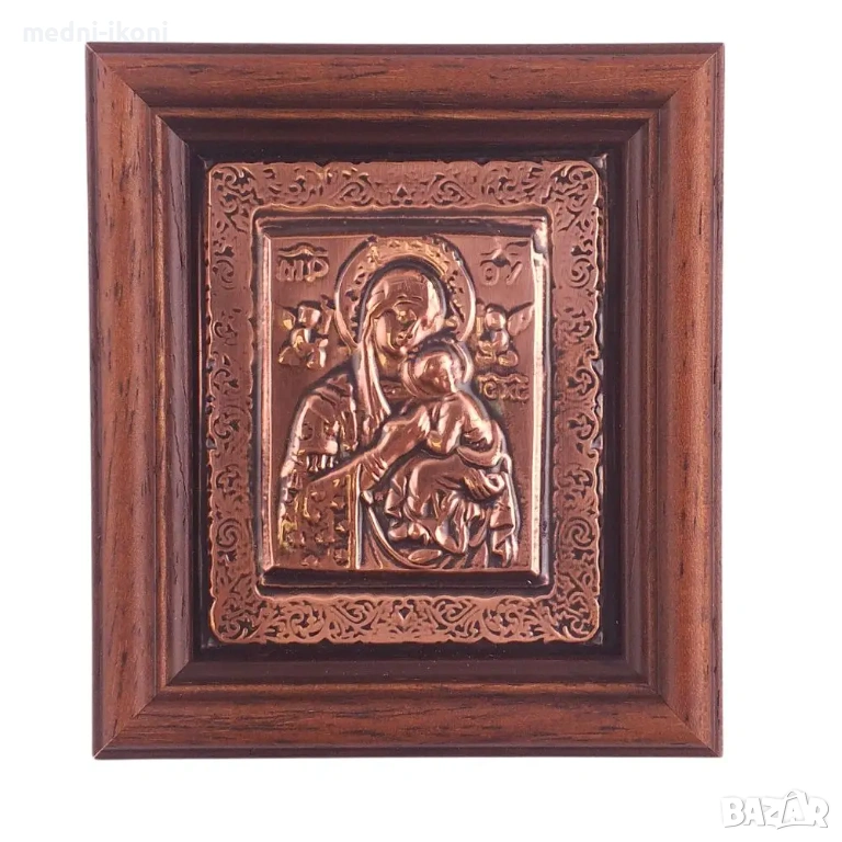 Иконата е ръчно изработена от чиста медна ламарина. Сложена е дървена рамка от екзотичното африканско дърво айос. Представлява авторска художествена репродукция на средновековна православна икона. Светицата е изобразена като "Пътеводителка" /Одигитрия/. Това е един от най-древните и най-разпространени начини за изобразяване на Света Богородица. Света Богородица е покровителка на майките, дома и семейството, пази децата, помага на бездетни, за успех и семейно щастие. Поради рамера си е подходяща да бъде поставена в чанта, или в колата.