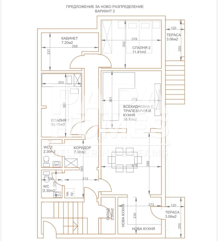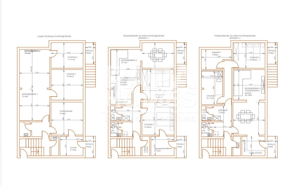 - Два професионално разработени варианта за преустройство, които не засягат никакви конструктивни елементи; новите вътрешни стени са предвидени от лек материал гипсокартон.