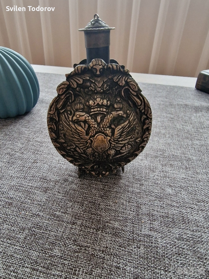 Антична руска месингова барутница от 19-ти век, украсена с релефен двуглав орел.