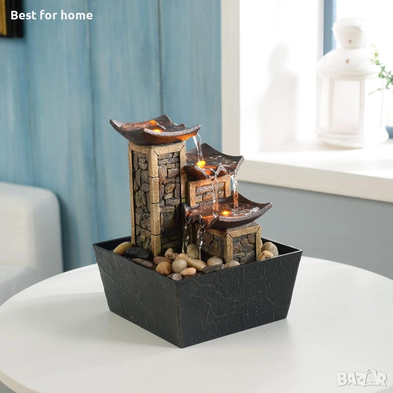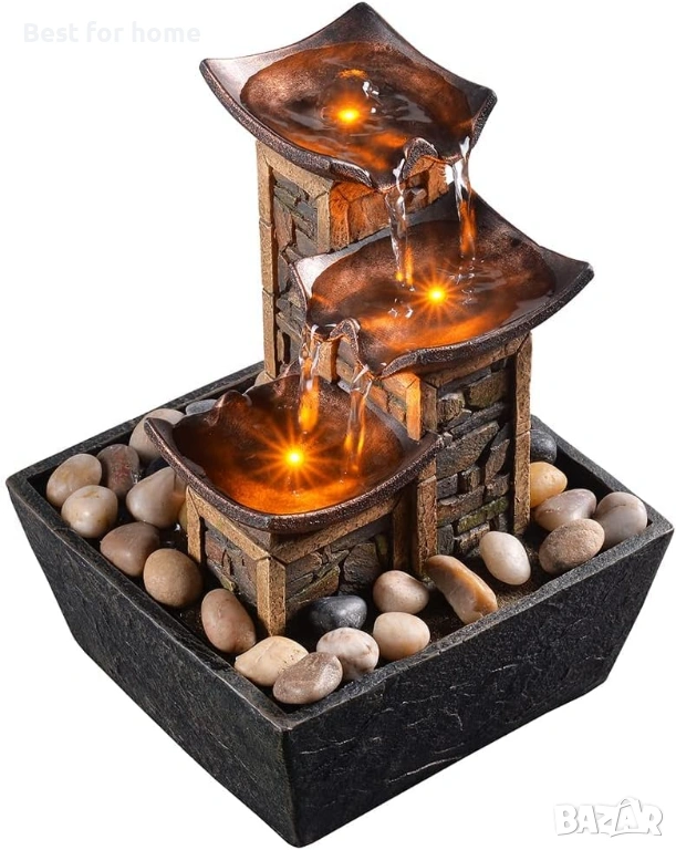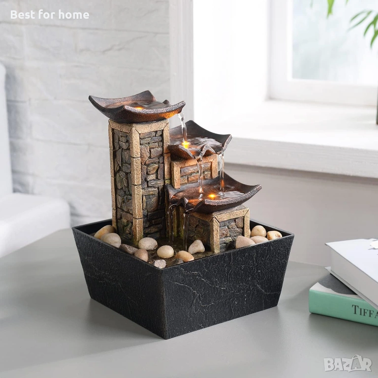 3-степенен фонтан за релаксация на маса, камък, осветен, 6,7 x 6,7 x 8,9 инча