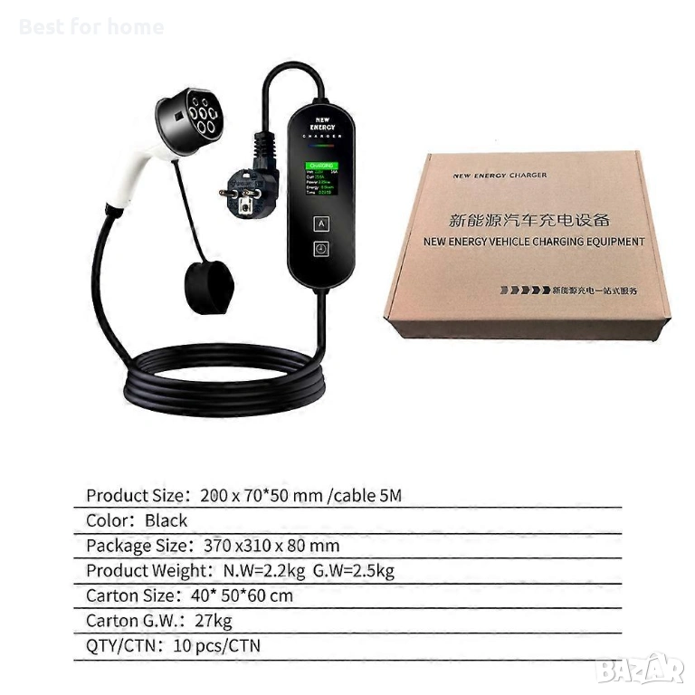Размер на опаковката: 370 * 310 * 80 мм, Тегло: 16A3.5KW -5m=2.5kg, 10m=3.5kg 32A7KW-5m=3.5kg, 10m=5kg