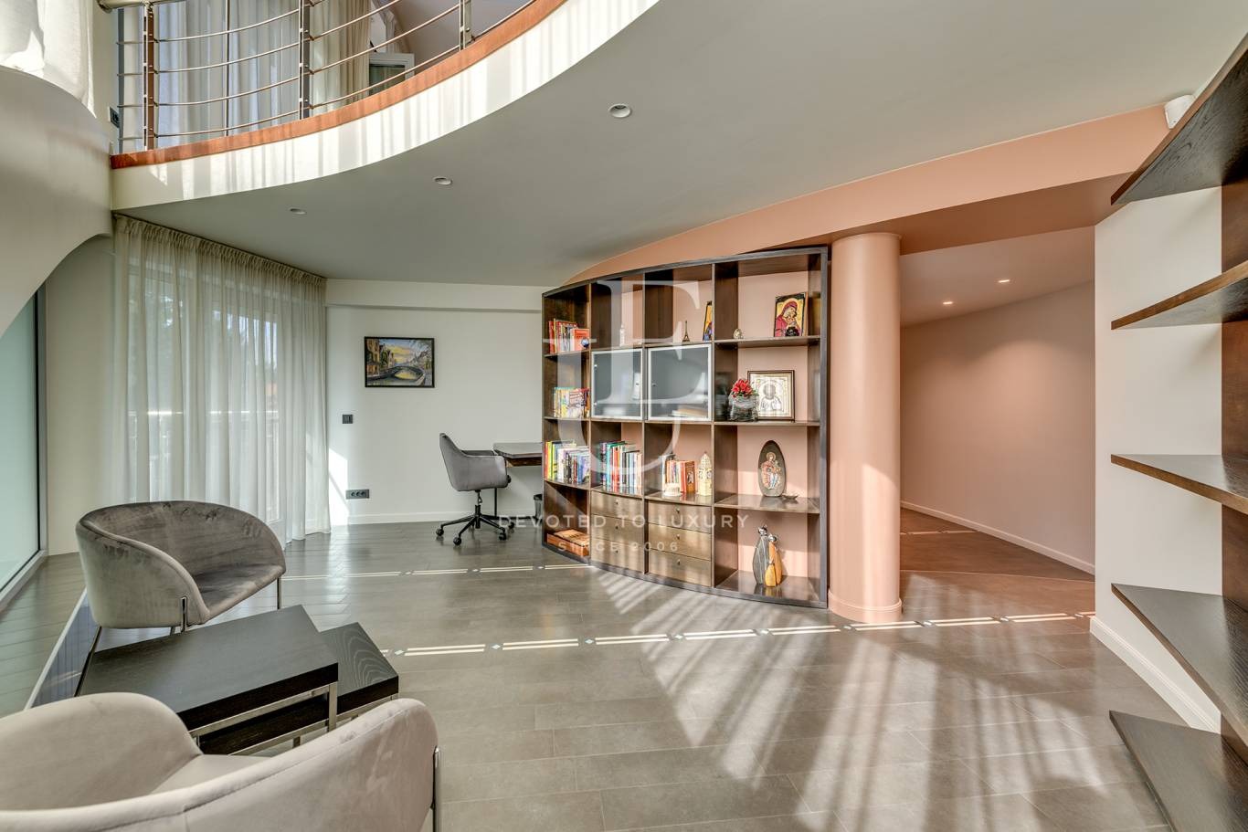 ?Разполага с четири спални, голяма дневна, с трапезарна и кухненска част, библиотека, няколко санитарни възела и няколко помощни помещения- тип склад, сервизно, перално помещение. Пространствата са организирани с мисъл за комфорт и гъвкавост, като позволяват обособяване на пета спалня, ако е необходимо. На последния етаж е разположен впечатляващ работен кабинет с високи тавани, изцяло южно изложение и френски прозорци, предлагащи спиращи дъха гледки към Витоша.