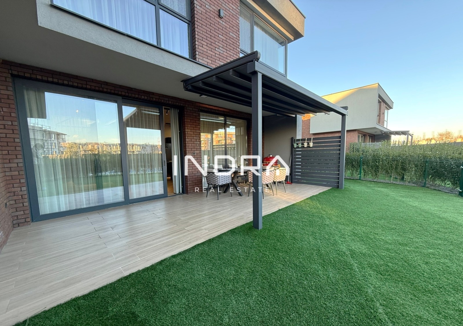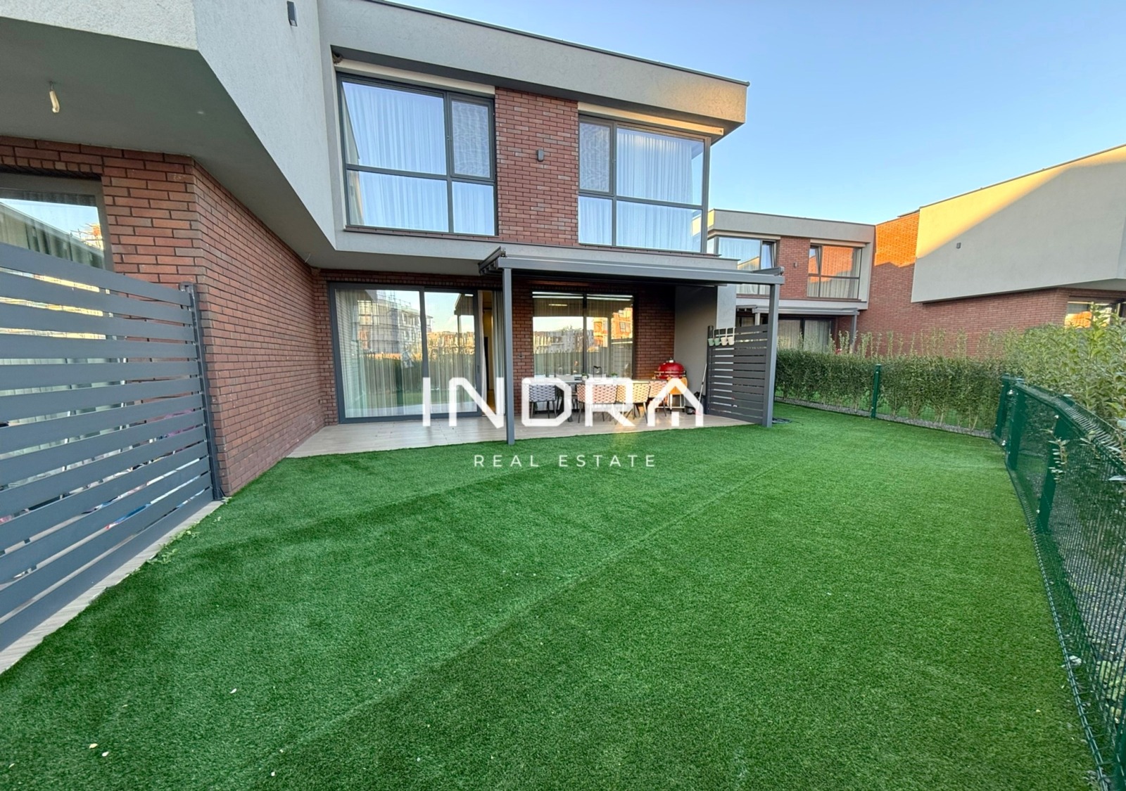 Къщата е 183 кв.м, на два етажа, с 3 самостоятелни спални, собствен двор и веранда 30 кв.м с барбекю зона, паркоместа.