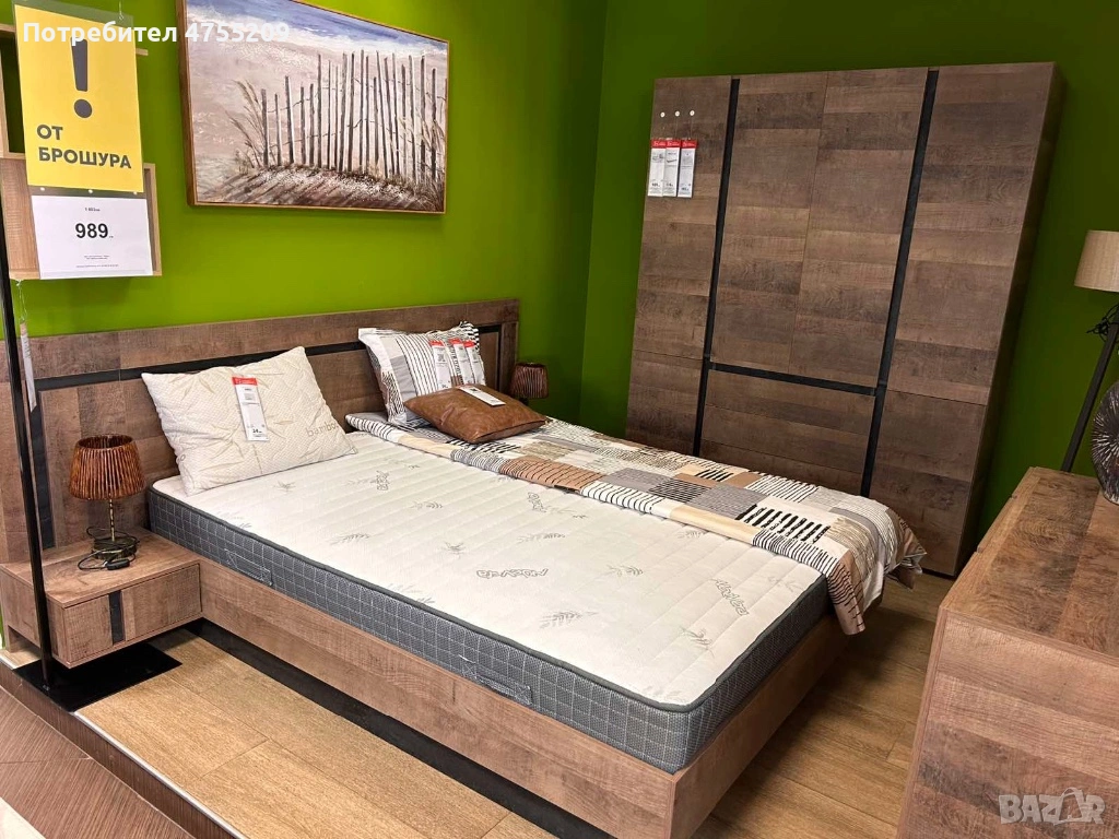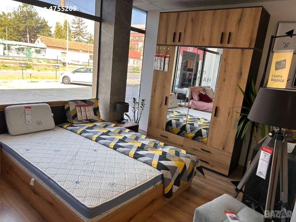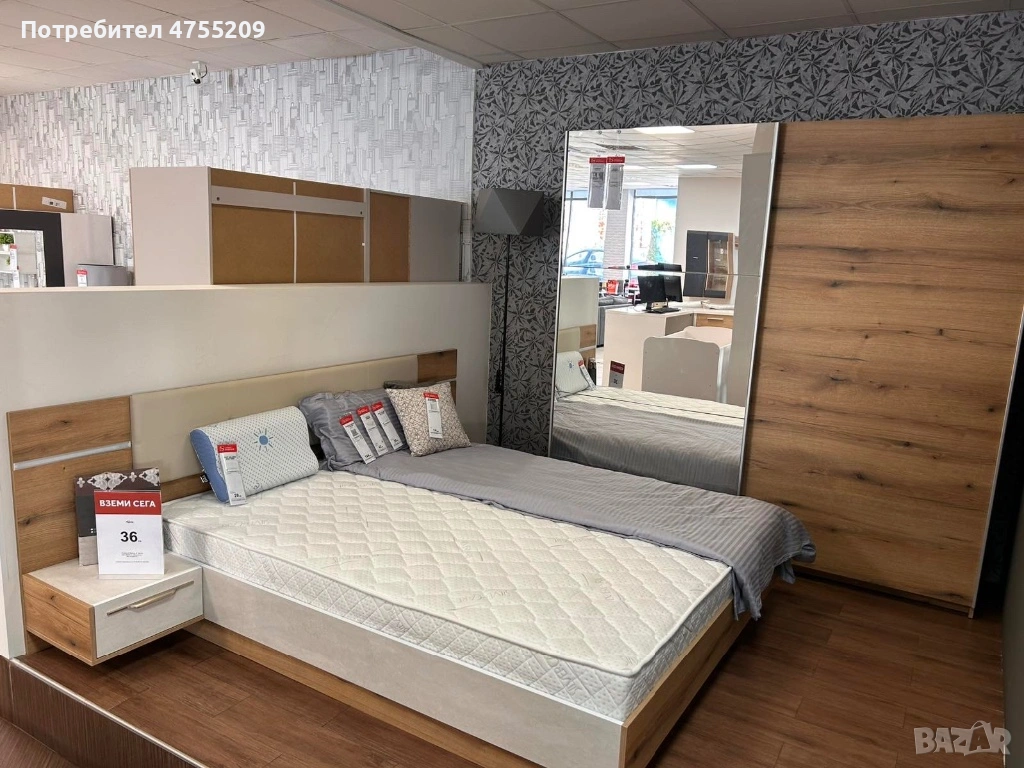 Удобна спалня с размери 160/200см, с нощни шкафчета, над тях се виждат LED светлинни ленти, таблата зад матрака има покритие от бяла еко кожа, придаваща елегантна визия. В ЦЕНАТА СЕ ВКЛЮЧВА ДОПЪЛНИТЕЛНО ЗАКУПЕНА ПОДМАТРАЧНА РАМКА (ВАЖИ И ЗА ТРИТЕ КОМПЛЕКТА). Гардеробът е просторен, с плъзгащи врати, една от които е голямо огледало. Има рафтове и пространство за закачалки. Снимките са направени в мебелния магазин. За повече информация и за комплектите от другите снимки на лично съобщение.