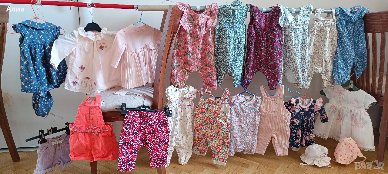 Дрешките на първата снимка са бодита с дълъг, къс ръкав, ританки, клинчета, рокличка. 31бр. Някои от дрешките са обличани, други не. Имат и отделни цени, може да се извадят ненужни дрешки. Нямат забележки. Втората снимка са красоти- летни гащеризончета, роклички, шапчици за момиченце от 0- 3-месеца. /56-62см/