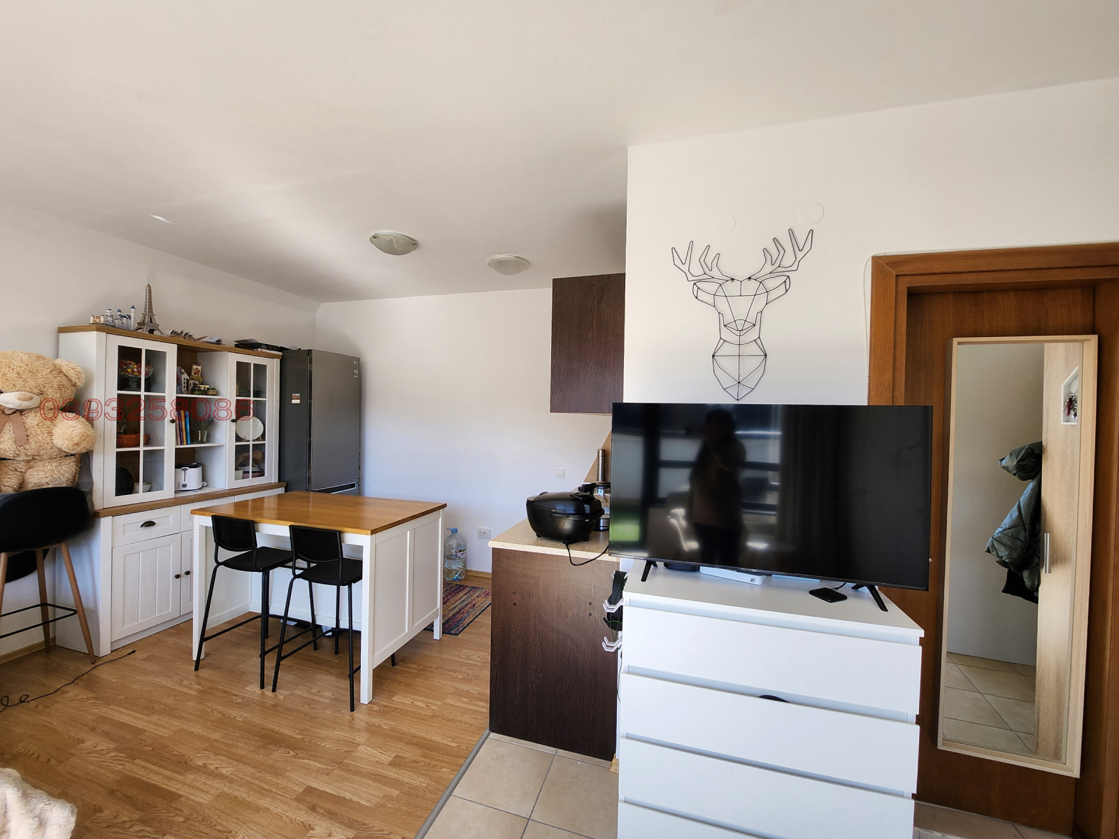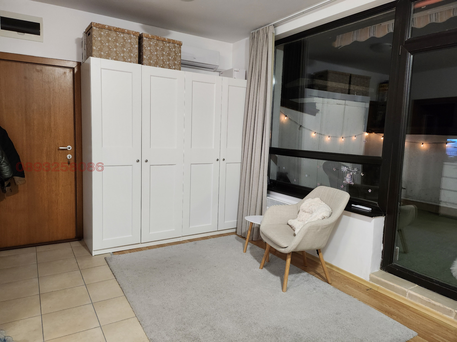 Дневна зона: Голям гардероб, спалня (160/200 см), нощни шкафчета, скрин, кресло, холна маса, пердета и килим.