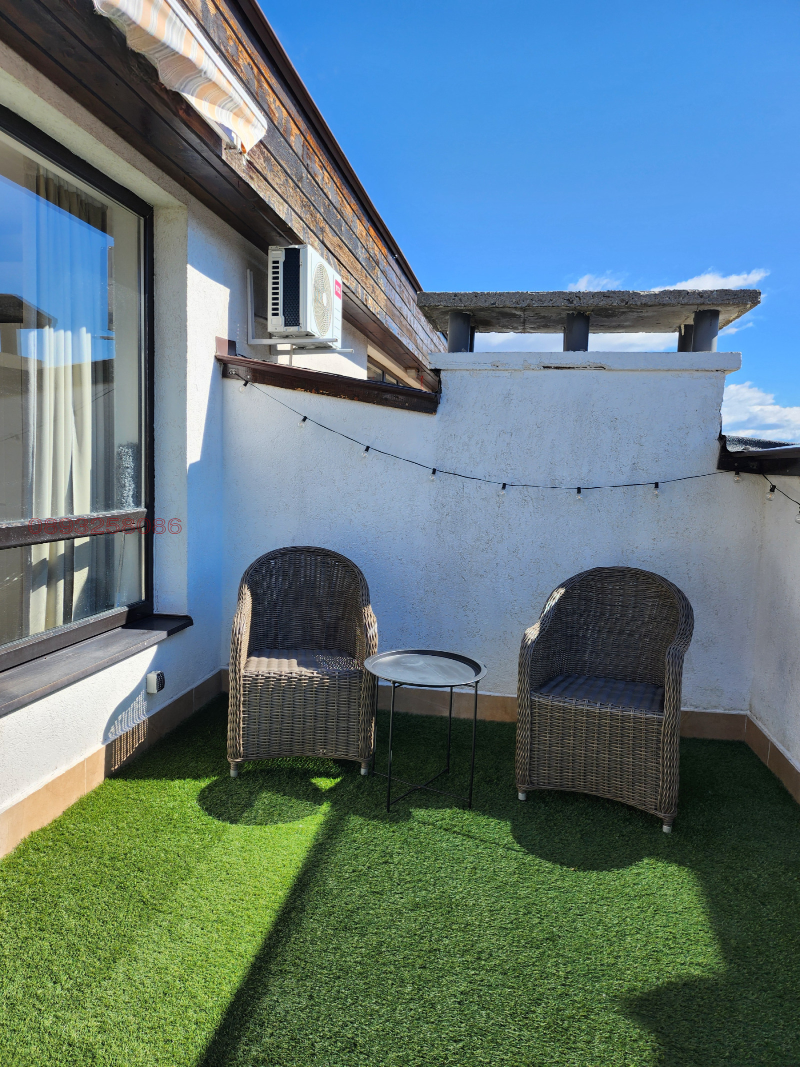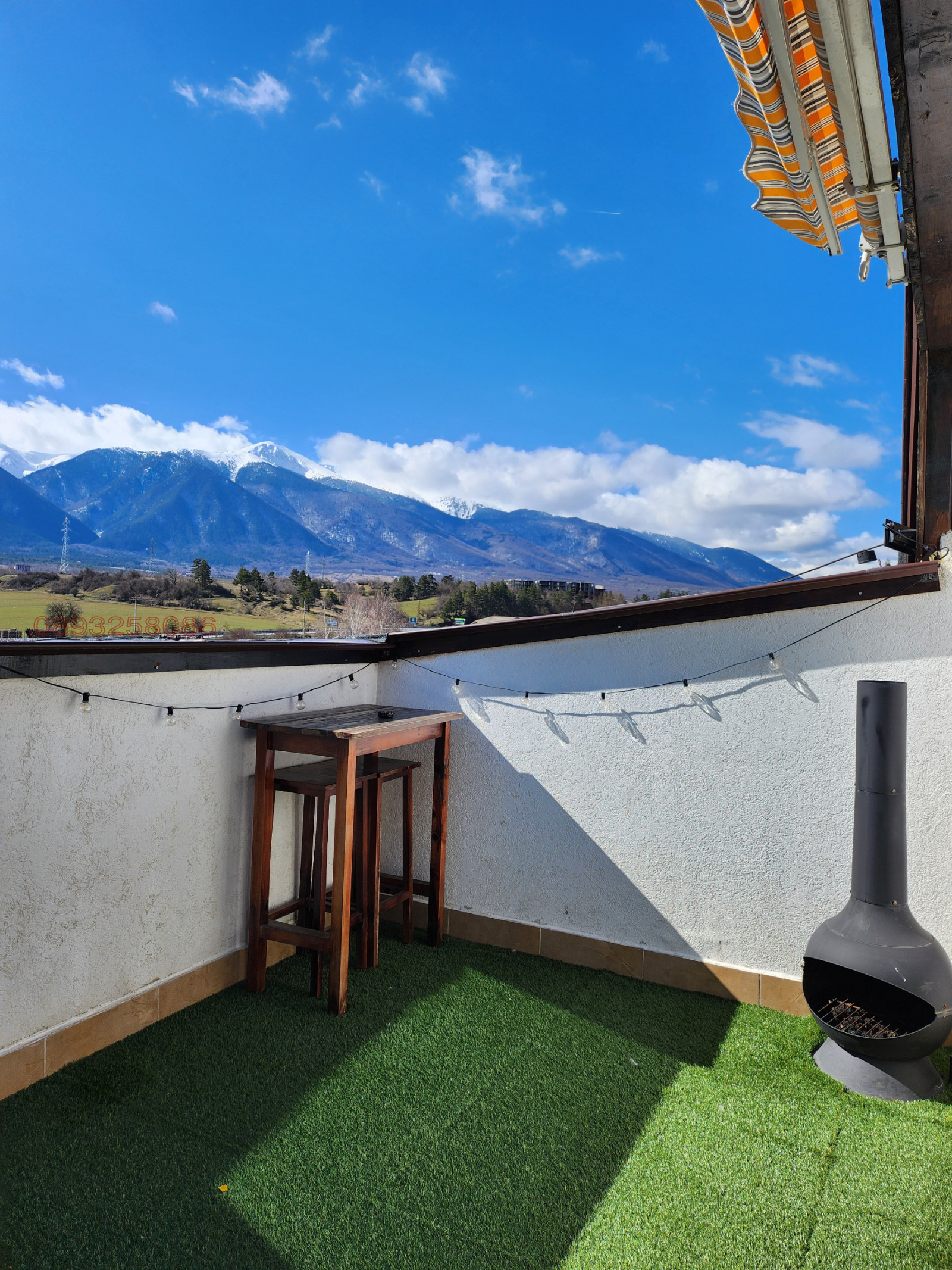 Тераса (15 м?): Просторна тераса с изкуствена трева и камина - идеално място за срещи с приятели, хранене на открито и наслаждаване на изгревите, залезите и панорамната гледка към планината и гората. Оборудвана е с маса, столове и кресла.