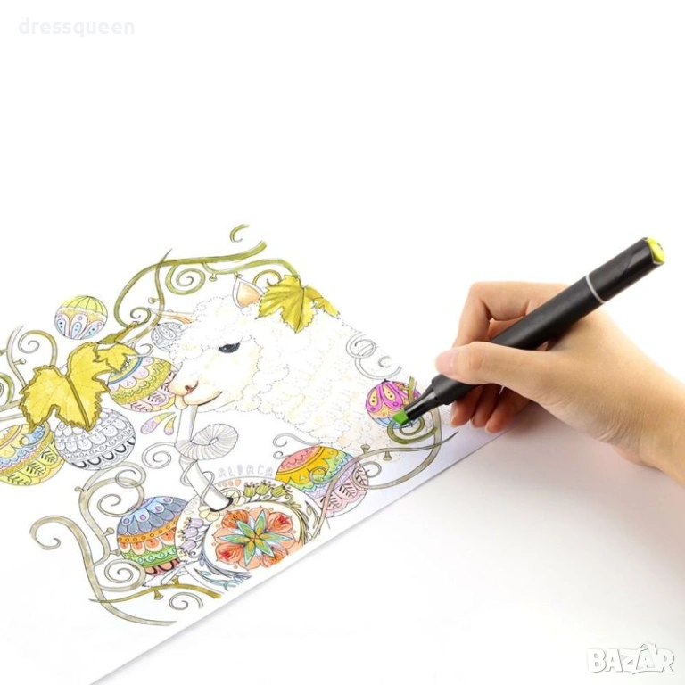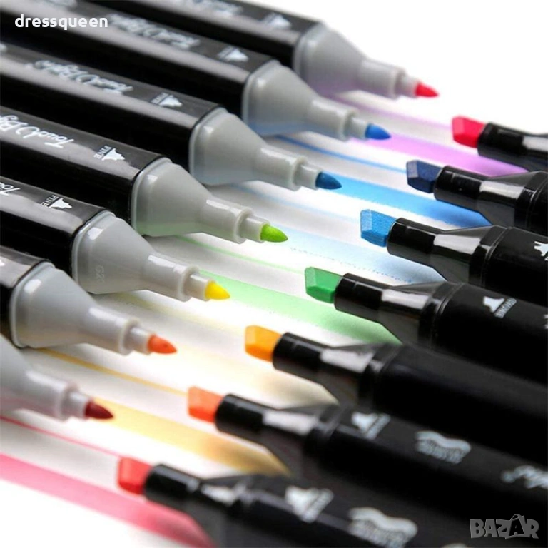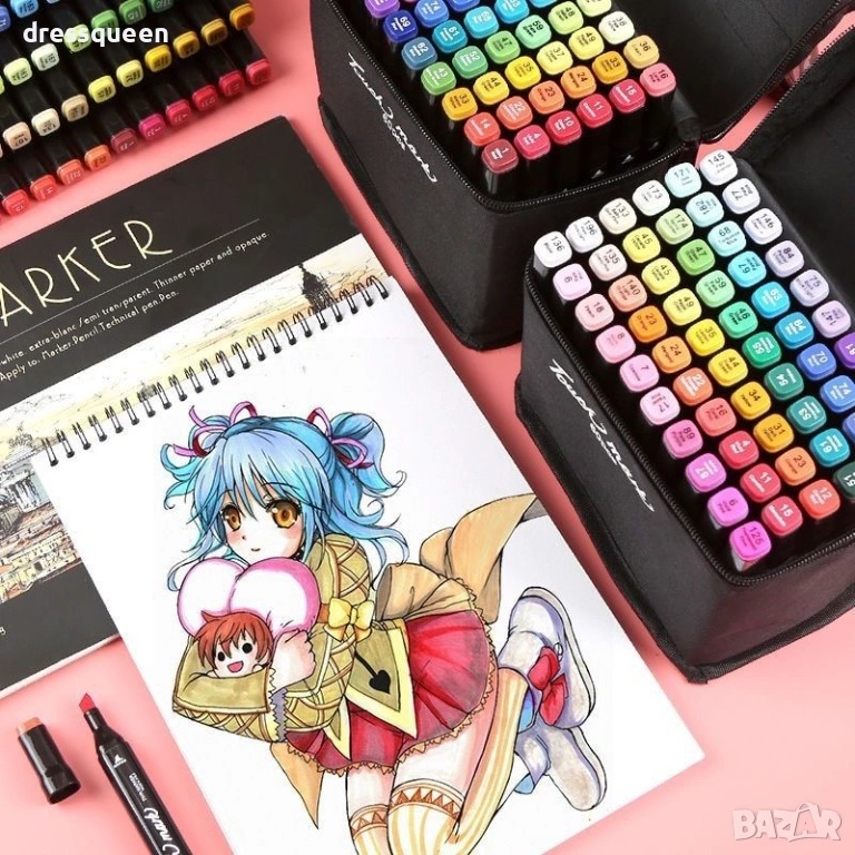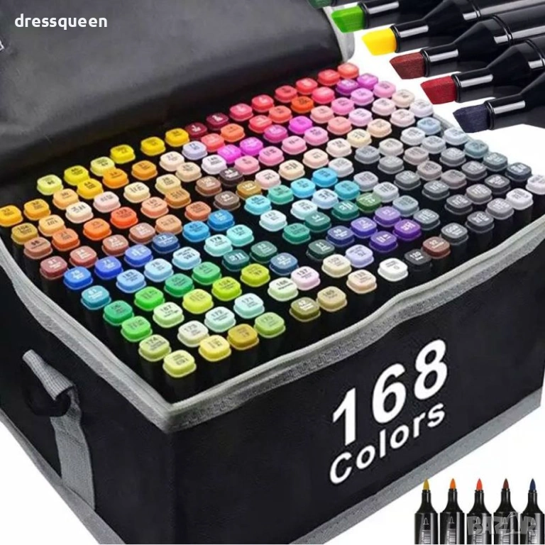 Детайлни спецификации и съдържание на продукта Пакетът съдържа 168 индивидуални маркера. Видът на туша е алкохолен, нетоксичен и изсъхва мигновено след нанасяне. Върховете са два вида, включващи фин писец за линии и широк ъглов писец за оцветяване. Всяка капачка има ясна номерация и цветен маркер за бърза ориентация в палитрата. В съдържанието ще откриете 168 броя алкохолни маркера заедно с 1 брой черна чанта с цип за организирано подреждане.