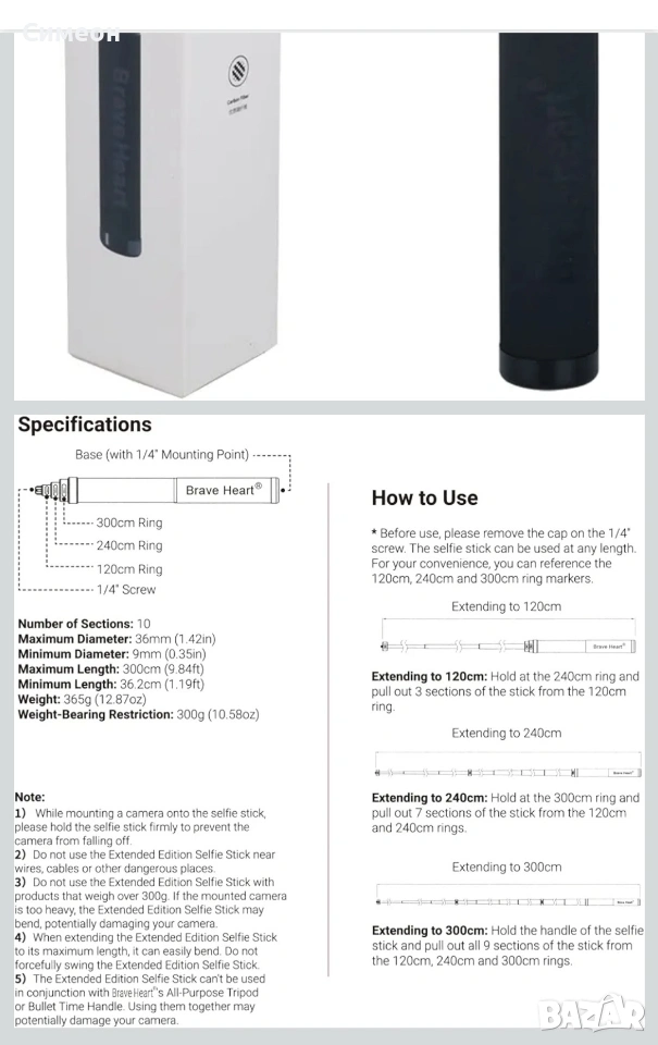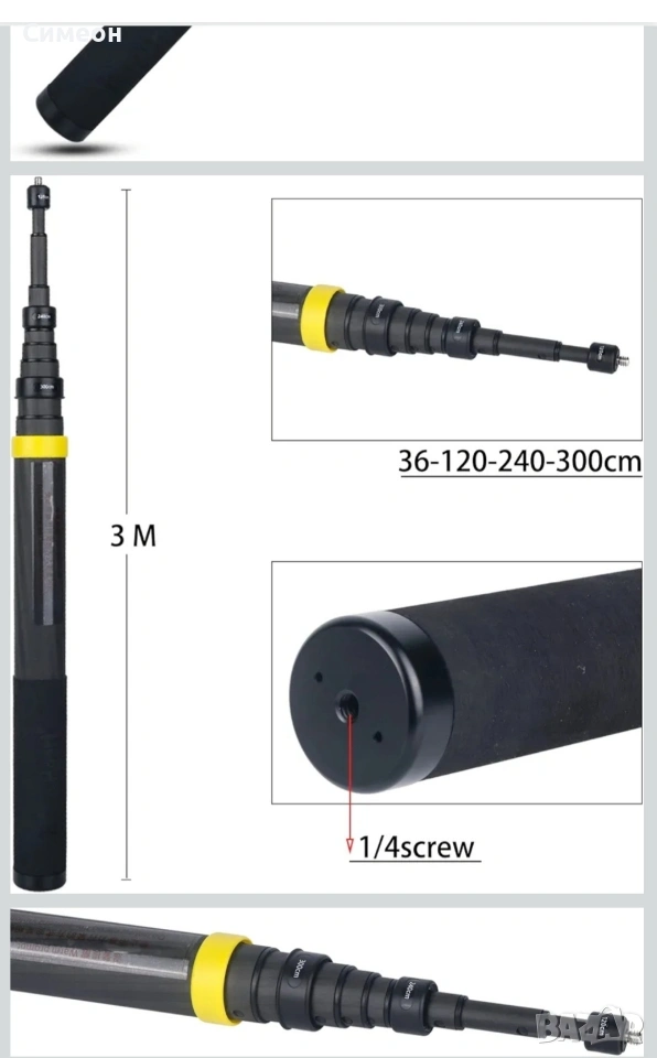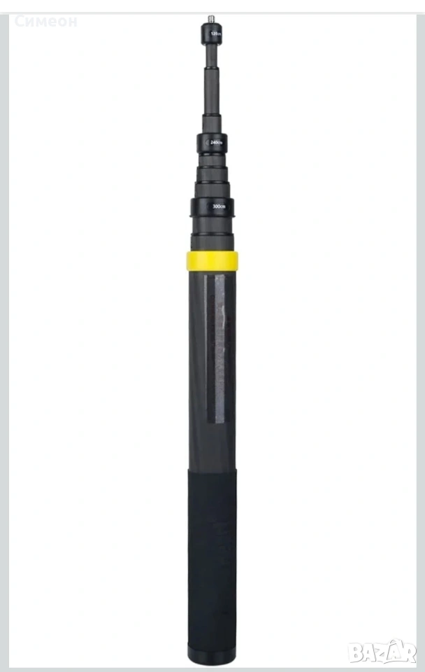 Супер дълъг телескопичен селфи стик от карбон (въглеродни влакна) – идеален за 360° заснемане и кадри с „дрон“ ефект, без да използвате дрон. При снимане с 360° камера и режим „Invisible Selfie Stick“ стикът практически изчезва от кадъра и получавате чисти, широкоъгълни гледни точки от високо и отстрани – перфектно за разходки, екшън спортове, пътувания, ски, колело, море и влогове. Моделът е с впечатляваща максимална дължина до 3 метра и позволява да отдалечите камерата достатъчно, за да хванете цялата сцена – групови кадри, панорами, динамични „трета персона“ видеа и снимки, които изглеждат като заснети от оператор. В прибрано положение е компактен и удобен за носене, а дръжката е с релеф за по-сигурен захват при работа. На самия стик има ориентировъчна маркировка за дължина (120 cm / 240 cm / 300 cm), което улеснява бързото нагласяне на кадъра според ситуацията. Характеристики: Тип: телескопичен „невидим“ селфи стик за 360° камери Максимална дължина: до 3 м (300 см) Прибрана дължина: около 36 см (14") Материал: карбон (лека и здрава конструкция) Тегло: под 0.86 lb (прибл. под 390 г) Захват/дръжка: релефна повърхност за стабилно държане Монтаж: стандартна резба 1/4"-20 отгоре за камера/аксесоар + 1/4"-20 резба отдолу за статив/дръжка/удължение Съвместимост (посочена за този тип стик): Insta360 ONE X4 / X3, ONE R, ONE RS, ONE X2, ONE, GO 2, GO 3 Цвят: черен Комплектът включва: 1 бр. карбонов селфи стик Brave Heart Edition (3 м) Оригинална кутия Транспортна/защитна вложка .
