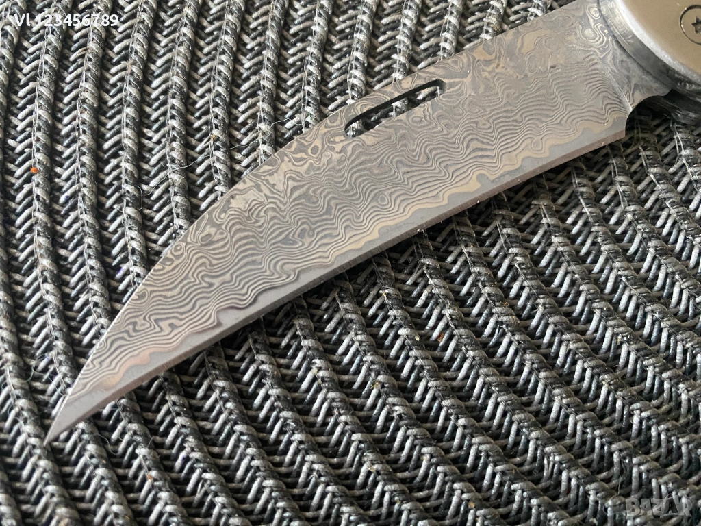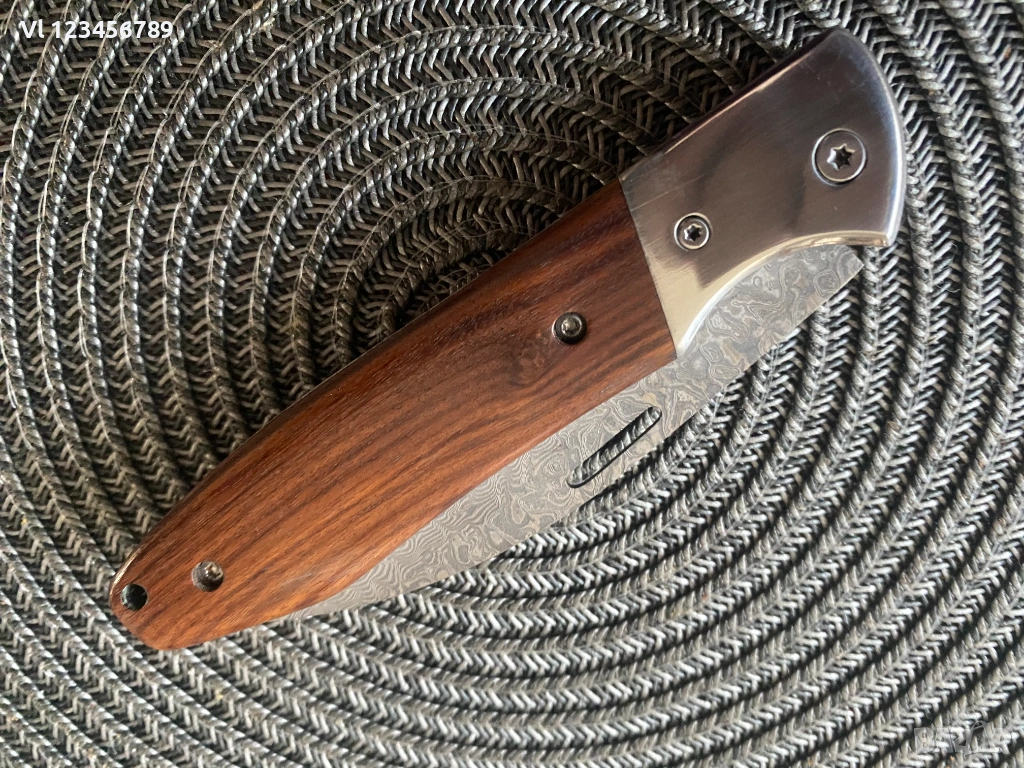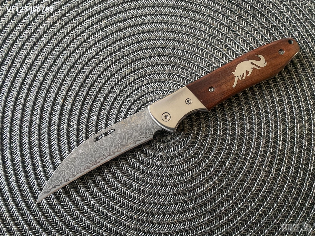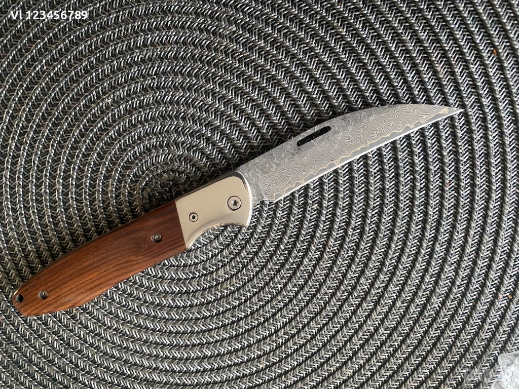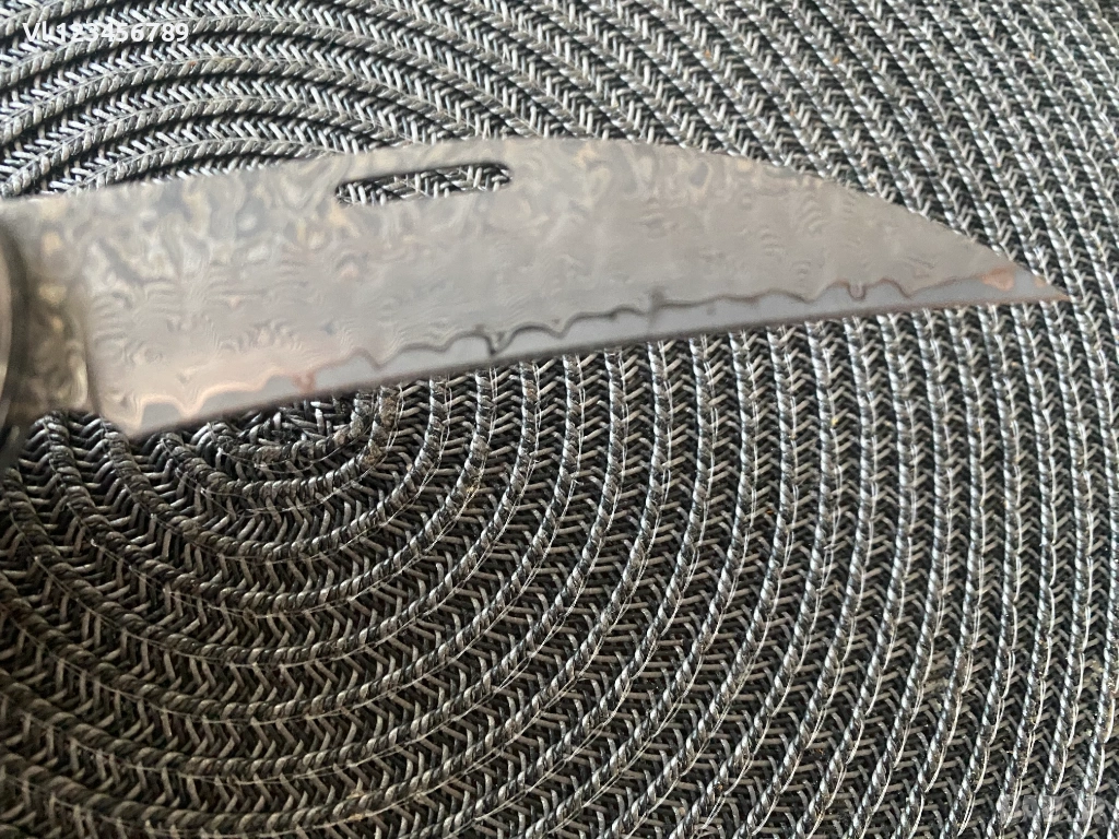 Дължина на острието: 9.00см,рисунка тип дамаска стомана, Острието е с форма-обратна дъга