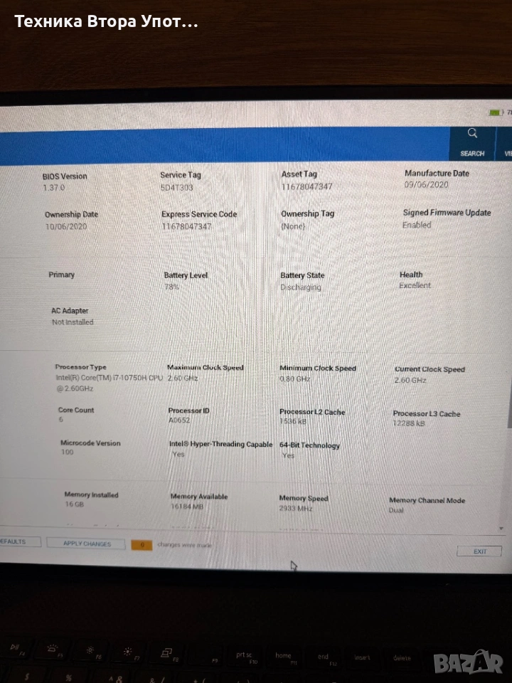 Процесор : i7-10750H (6 Ядрен , 12- нишков ,2-60-5.00GHz ,12MB Кеш)