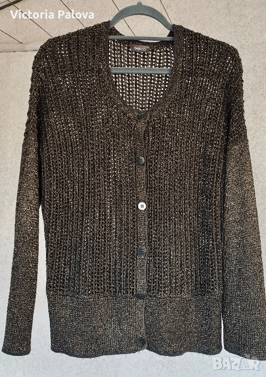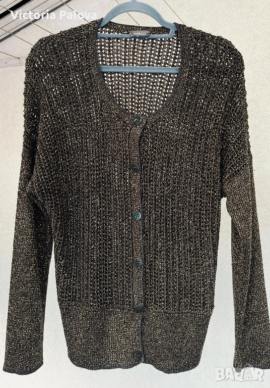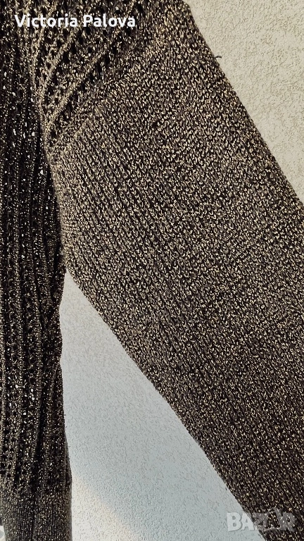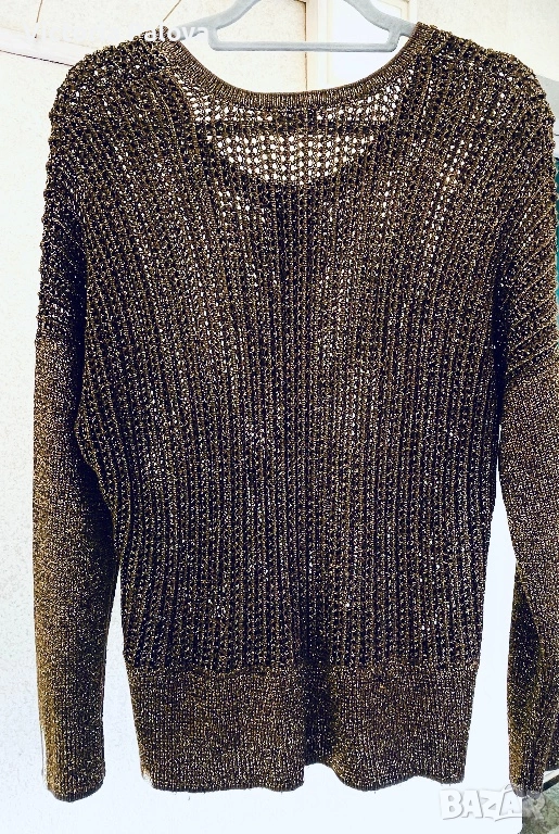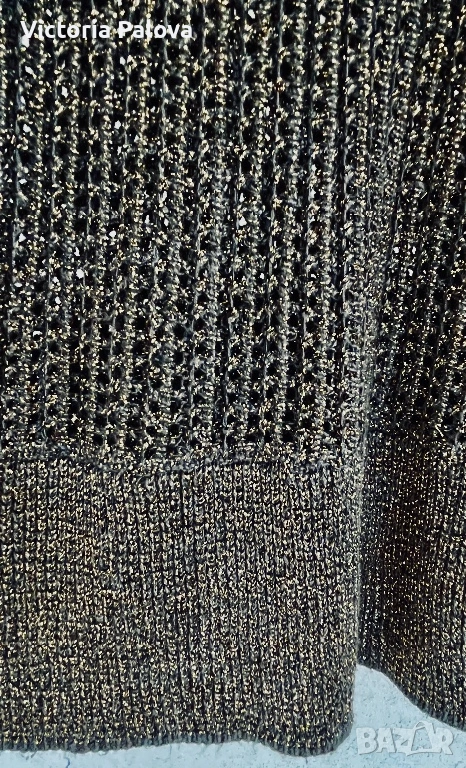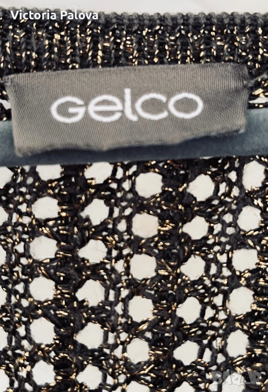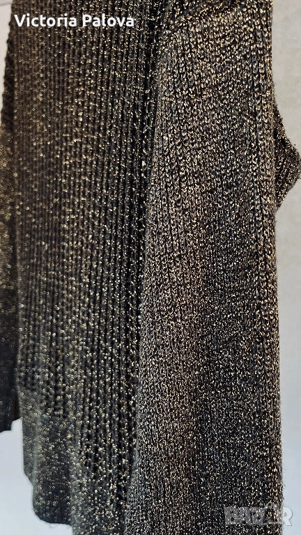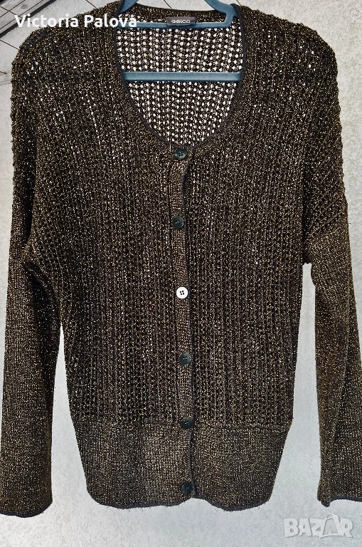 Тази уникална жилетка Gelco с вплетени златни метални нишки е истински рядък бисер, който вече не се произвежда и не може да се намери никъде – марката Gelco прекрати дейността си и точно такъв модел просто не съществува повече в продажба. На слънце и на всякаква светлина тя блести невероятно красиво, с деликатен, но много видим луксозен златен блясък, който я прави да изглежда невероятно красиво. Плетката е специална – основното тяло е лека, въздушна ажурна плетка, (open knit), докато ръкавите и долният край са с по-плътна, красива ребрена структура, което създава ефектен контраст и отлична форма. Има модерен паднал ръкав, който стои много комфортно и релаксирано. Материята е тежка, плътна и високоеластична – разтяга се приятно, но запазва перфектната си форма. Перфектна за ежедневието, но и за по-елегантни тоалети. С дънки и ботуши – небрежно шик, с рокля или пола – вечерен лукс. Паднало рамо - 73см, ГО - 59см, дължина - 66см, ръкав - 44см.