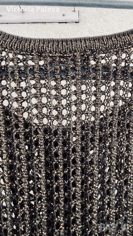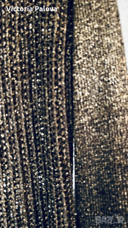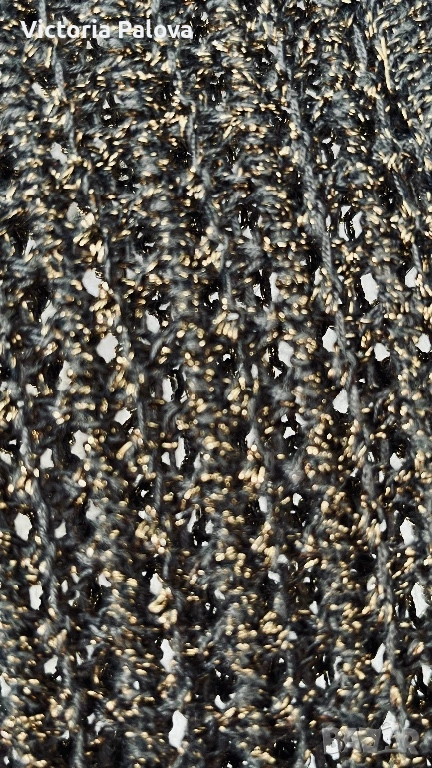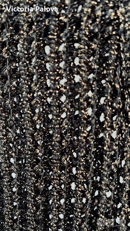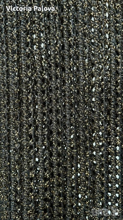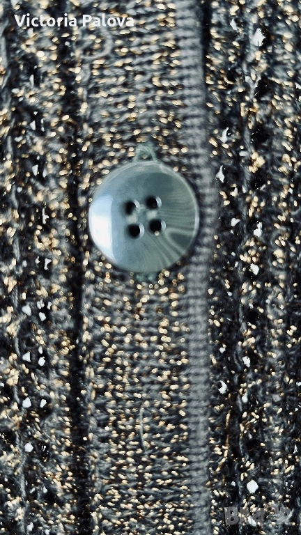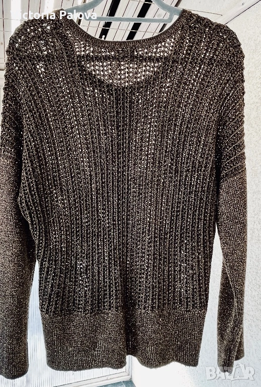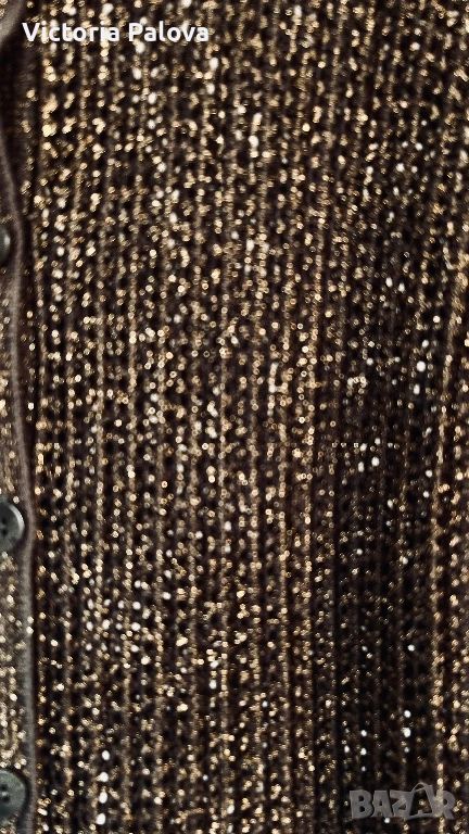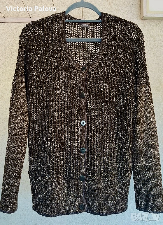 Тази уникална жилетка Gelco с вплетени златни метални нишки е истински рядък бисер, който вече не се произвежда и не може да се намери никъде – марката Gelco прекрати дейността си и точно такъв модел просто не съществува повече в продажба. На слънце и на всякаква светлина тя блести невероятно красиво, с деликатен, но много видим луксозен златен блясък, който я прави да изглежда невероятно красиво. Плетката е специална – основното тяло е лека, въздушна ажурна плетка, (open knit), докато ръкавите и долният край са с по-плътна, красива ребрена структура, което създава ефектен контраст и отлична форма. Има модерен паднал ръкав, който стои много комфортно и релаксирано. Материята е тежка, плътна и високоеластична – разтяга се приятно, но запазва перфектната си форма. Перфектна за ежедневието, но и за по-елегантни тоалети. С дънки и ботуши – небрежно шик, с рокля или пола – вечерен лукс. Паднало рамо - 73см, ГО - 59см, дължина - 66см, ръкав - 44см.