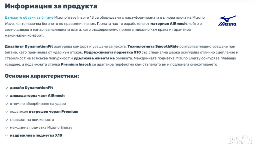 Технология MIZUNO ENERZY: Използва се специална пяна в областта на петата, която осигурява меко омекотяване и добра възвращаемост на енергията.