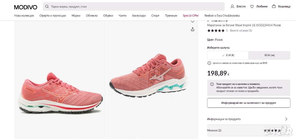 Mizuno Wave Inspire 18 в дамски вариант. Този конкретен цвят често се назовава като "Rosette", "Snow White" или "Garnet Rose".