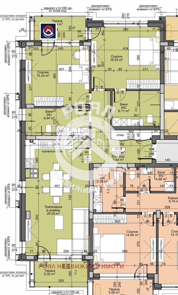 Разпределение: просторна дневна с кухненска зона, 2 спални, 2 бани с тоалетни, 2 балкона