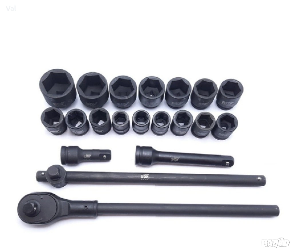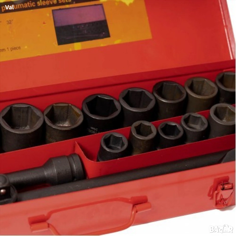 Комплектът включва: Вложки: Размери 19мм, 21мм, 22мм, 23мм, 24мм, 27мм, 28мм, 30мм, 32мм, 34мм, 36мм, 38мм, 41мм, 46мм, 50мм; Удължители: 100мм и 200мм.; Върток: Т-450мм.;
