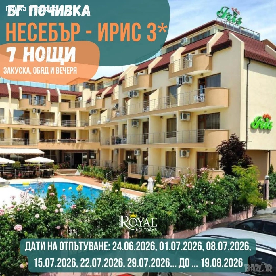 🔰Промоционална оферта🔰 🍹Лятна почивка в България - хотел Ирис 3*, Несебър🏖️ 🗓️Дати: от Юни до Септември 2026 💰Цена - 382.96 €💰 (цена на човек, настанен в двойна стая) Цената включва: 🟢Транспорт с лицензиран автобус 🟢7 нощувки със закуски, обяди и вечери в хотел Ирис 3* 🟢Wi-fi интернет 🟢Ползване на басейн с детска част *Дете от 0 до 3.99г настанено с двама възрастни заплаща само транспорт седалка - 43 евро. *Дете от 4 до 11.99 настанено с двама възрастни заплаща 270 евро. 👉Хотел „Ирис“ се намира в новата част на гр. Несебър на по-малко от 100м. от плаж „Тихия залив“ с водни атракции за малки и големи. 📲 За информация и резервации: ☎️ 0876 550 550 | 0877 550 500 | 0878 550 908