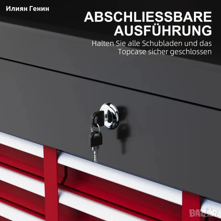 Заключващ се за допълнителна сигурност: Заключващият се механизъм държи всички чекмеджета и горното отделение сигурно затворени. Включени са два ключа за куфара с инструменти, което гарантира, че инструментите ви винаги са безопасно съхранени, когато сте далеч.
