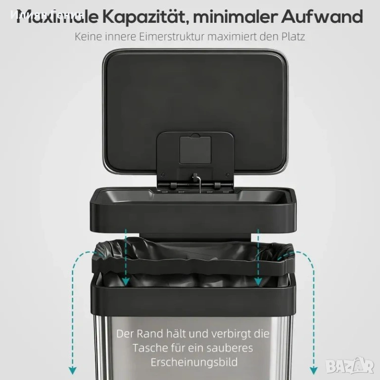 ✔ Дизайнът без вътрешна кофа увеличава максимално капацитета и значително опростява почистването на коша.