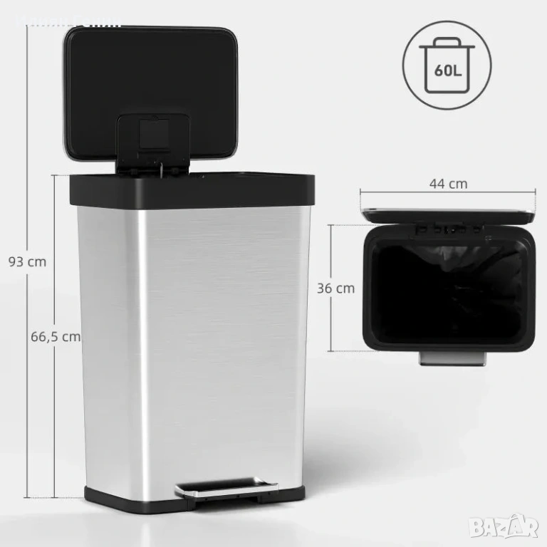 ✔ Големият капацитет от 60 литра на кошчето за боклук с педал намалява честото изпразване, идеално за натоварени домакинства.