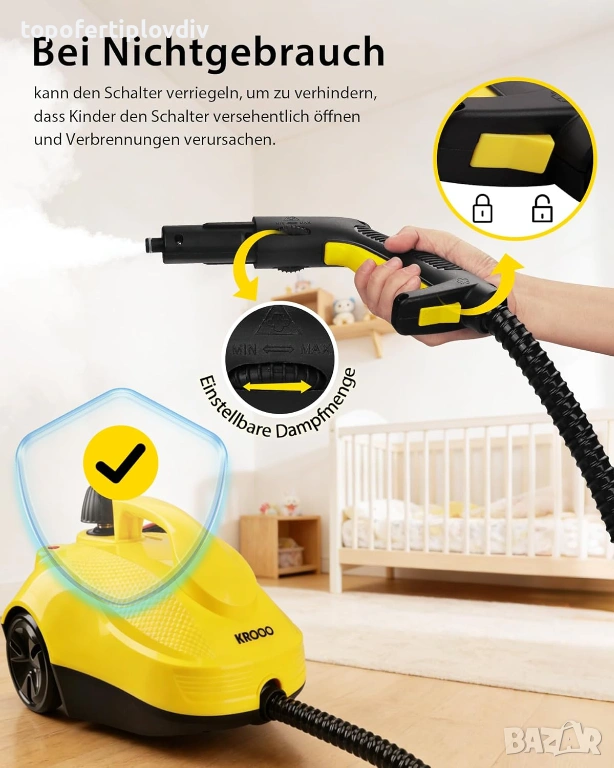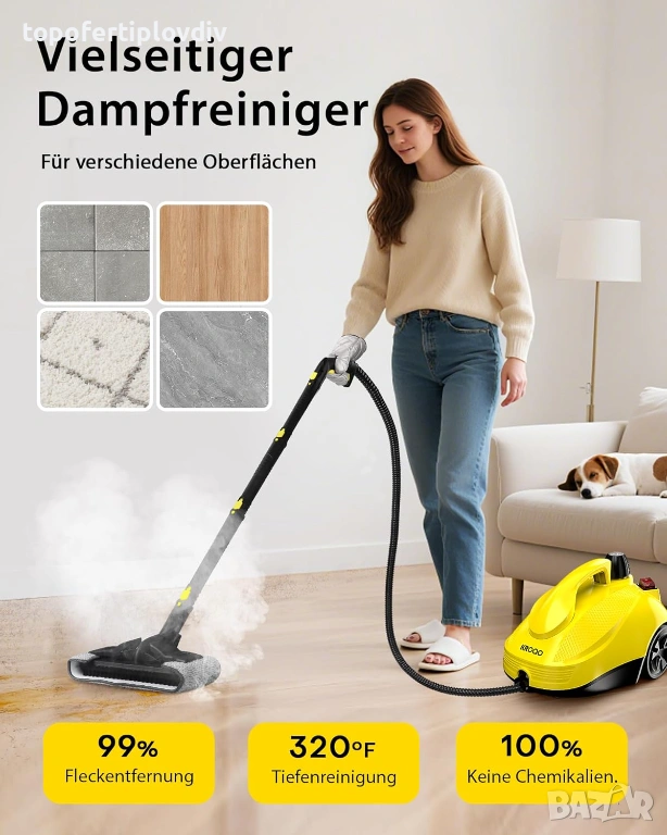Многофункционални аксесоари: почистването е лесно. Предлагаме 23 безплатни аксесоара, подходящи за различни повърхности като подове, плочки, прозорци и интериорни декорации. Идеална е и за почистване на килими, почистване на автомобили, дезинфекция на дивани, матраци, тапицерии, почистване на фурни и премахване на прахови акари от платнени дивани.