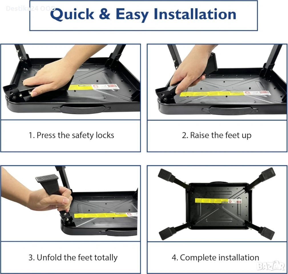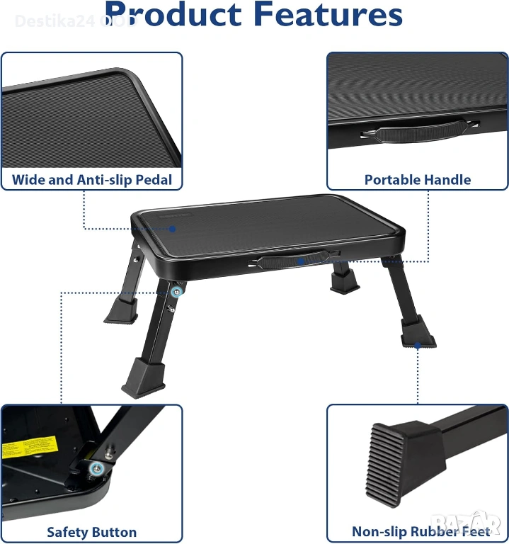 Платформата е широка и с противоплъзгаща текстура, а крачетата са снабдени със специални гумени накрайници, които предотвратяват плъзгане върху различни настилки – плочки, дърво или мокет.