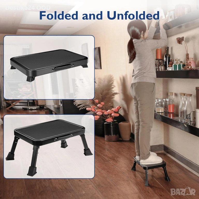 Практично и здраво сгъваемо метално стъпало, което ще ви помогне лесно да достигате високи шкафове, рафтове или други труднодостъпни места у дома. Подходящо за кухня, баня, гараж, офис, каравана или къмпинг.