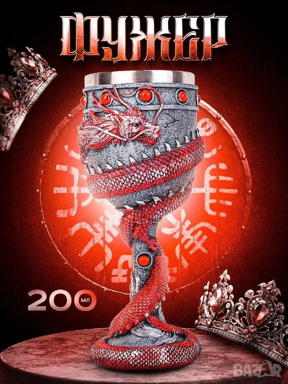 чаша за вино, изработена от полирезин и метал. Външната част е богато декорирана с релефни фентъзи елементи, а вътрешността е от метална чаша (неръждаема стомана), подходяща за реална употреба.