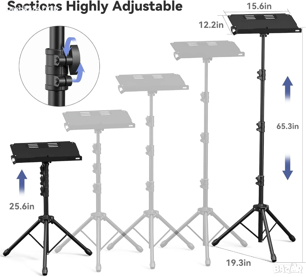 Многофункционална регулируема стойка тип трипод, подходяща за проектор, лаптоп, таблет, пулт за ноти или друга техника. Идеално решение за използване у дома, в офис, студио, сцена, презентации или DJ оборудване.