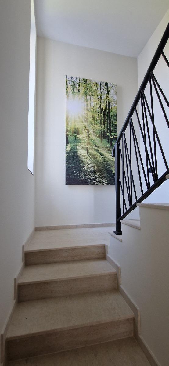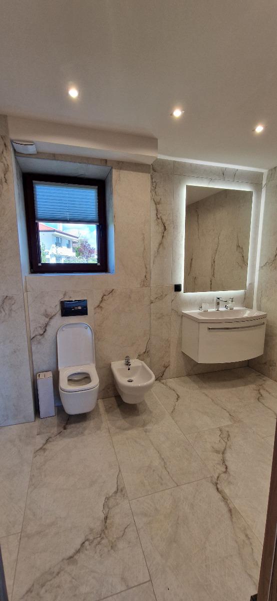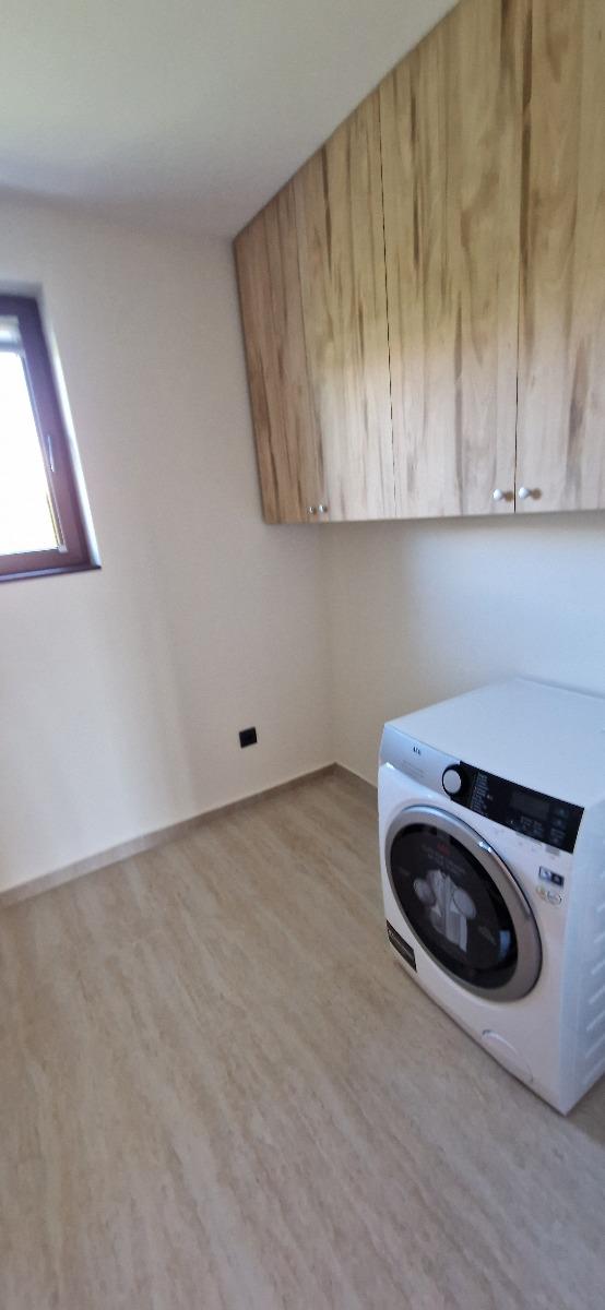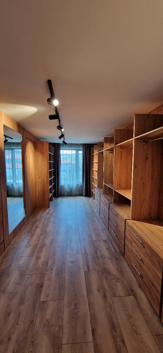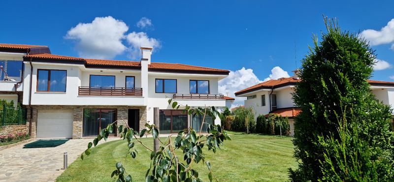 Къщата е току що завършена и напълно обзаведена по дизайнерски проект с висок клас електроуреди и качествени мебели. Състои се от входно антре на първия етаж, слънчева всекидневна, кухня, кабинет/спалня, топъл гараж, котелно, перално помещение, баня с wc. На второто ниво са разположени 3 непреходни спални, огромна гардеробна, и 2 бани с wc. Климатизацията е с висок клас термопомпа 'Mitsubishi', като навсякъде има подово отопление. Дограмата е от най-висок клас 'Bluevolution', използвана за пасивни къщи с троен стъклопакет. Изолацията е 15см. Дворът е озеленен и осветен и има възможност за паркиране на още автомобили. Огледи са възможни, след предварителна уговорка ежедневно на GSM.:0888350355 При по-дългосрочно наемане и предплащане, цената може да бъде договаряна