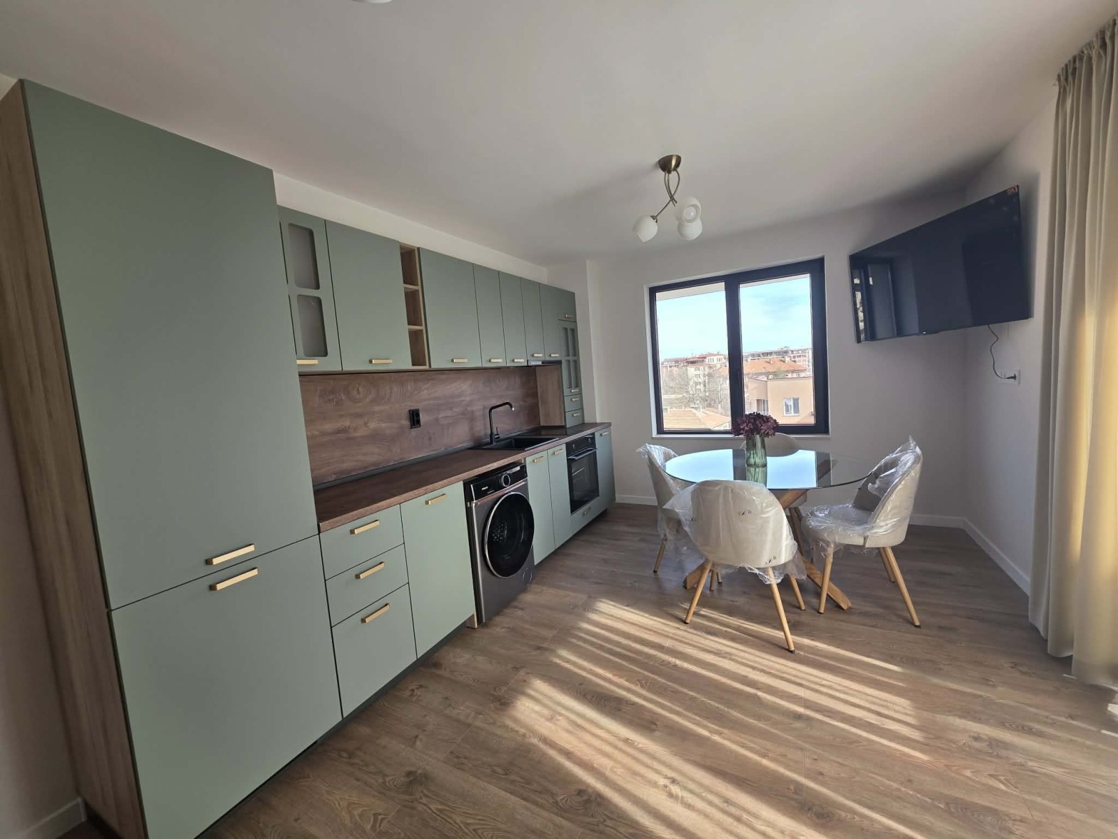 Дневната зона предлага мека мебел, холна маса и кът за отдих, обединени с трапезария и напълно оборудвана кухня с вградени електроуреди. Големите прозорци осигуряват отлична естествена светлина.