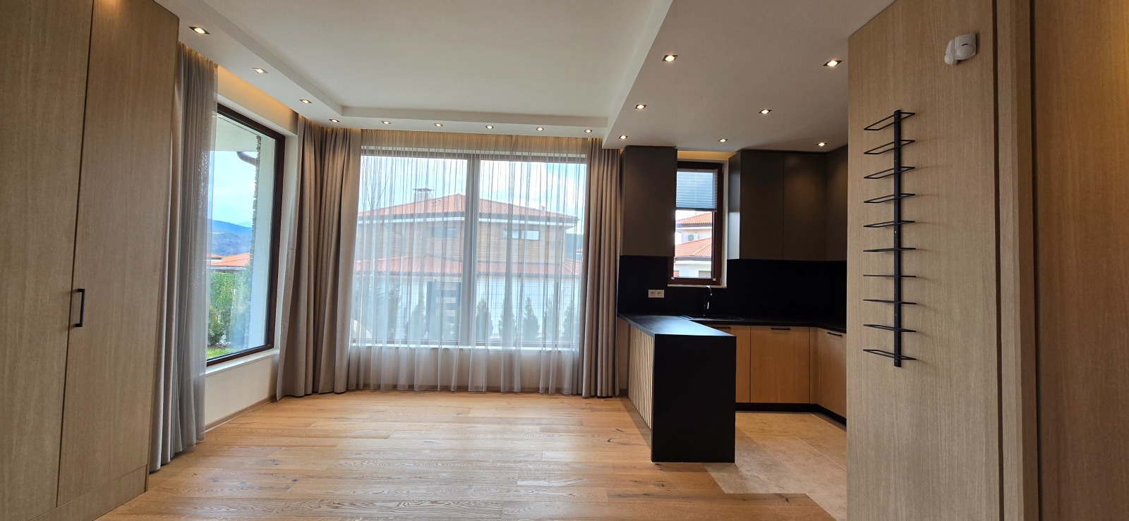 Къщата е с отоплителна инсталация Mitsubishi Zubadan,подово отопление,3 спални с френски паркет,3 бани(изработени от италиански мрамор),перално помещение, покрит навес за 2 автомобила,както и външно барбекю,дворно осветление и поливна система.