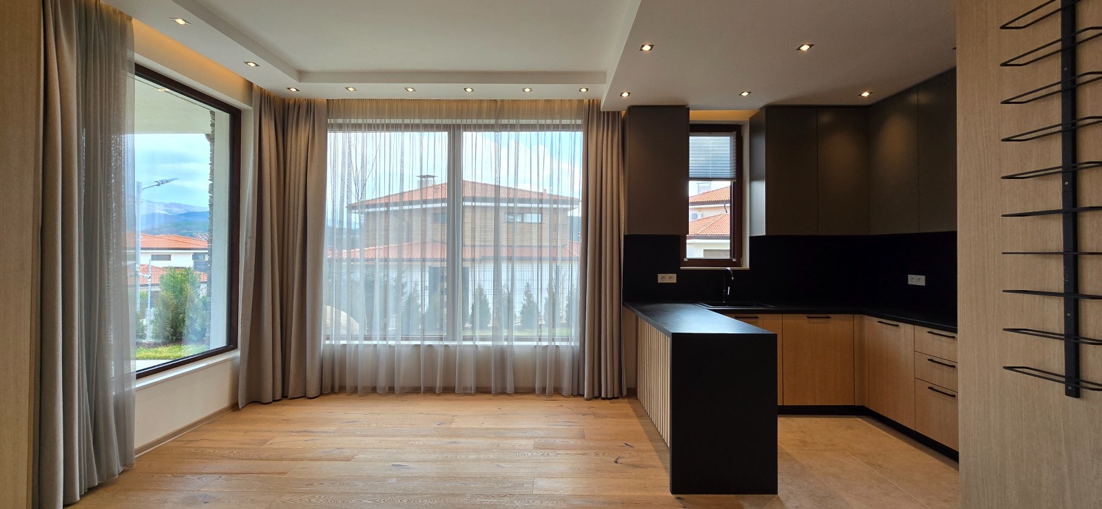 Къщата е с отоплителна инсталация Mitsubishi Zubadan,подово отопление,3 спални с френски паркет,3 бани(изработени от италиански мрамор),перално помещение, покрит навес за 2 автомобила,както и външно барбекю,дворно осветление и поливна система.