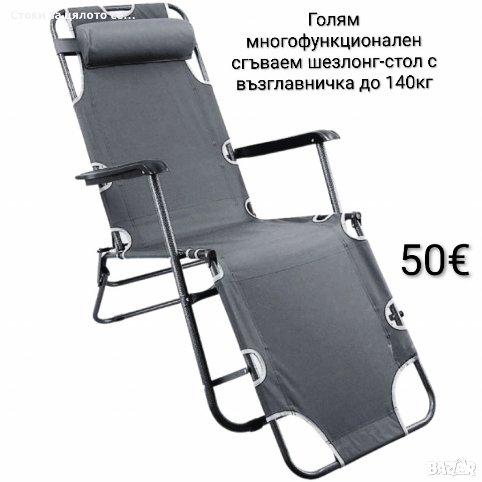 Голям многофункционален сгъваем шезлонг-стол с възглавничка до 140кг, снимка 1 - Градински мебели, декорация  - 53717640 Голям многофункционален сгъваем шезлонг-стол с възглавничка до 140кг, снимка 2 - Градински мебели, декорация  - 53717640 Голям многофункционален сгъваем шезлонг-стол с възглавничка до 140кг, снимка 3 - Градински мебели, декорация  - 53717640 1/3
